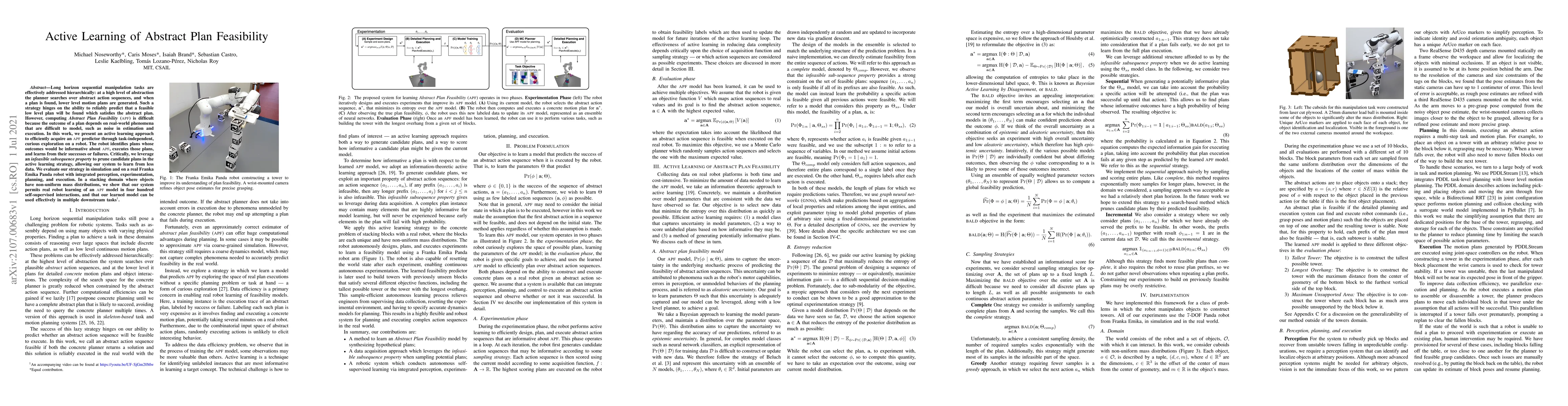 Long horizon sequential manipulation tasks are effectively addressed hierarchically: at a high level of abstraction the planner searches over abstract action sequences, and when a plan is found, lower level motion plans are generated. Such a strategy hinges on the ability to reliably predict that a feasible low level plan will be found which satisfies the abstract plan. However, computing Abstract Plan Feasibility (APF) is difficult because the outcome of a plan depends on real-world phenomena that are difficult to model, such as noise in estimation and execution. In this work, we present an active learning approach to efficiently acquire an APF predictor through task-independent, curious exploration on a robot. The robot identifies plans whose outcomes would be informative about APF, executes those plans, and learns from their successes or failures. Critically, we leverage an infeasible subsequence property to prune candidate plans in the active learning strategy, allowing our system to learn from less data. We evaluate our strategy in simulation and on a real Franka Emika Panda robot with integrated perception, experimentation, planning, and execution. In a stacking domain where objects have non-uniform mass distributions, we show that our system permits real robot learning of an APF model in four hundred self-supervised interactions, and that our learned model can be used effectively in multiple downstream tasks.