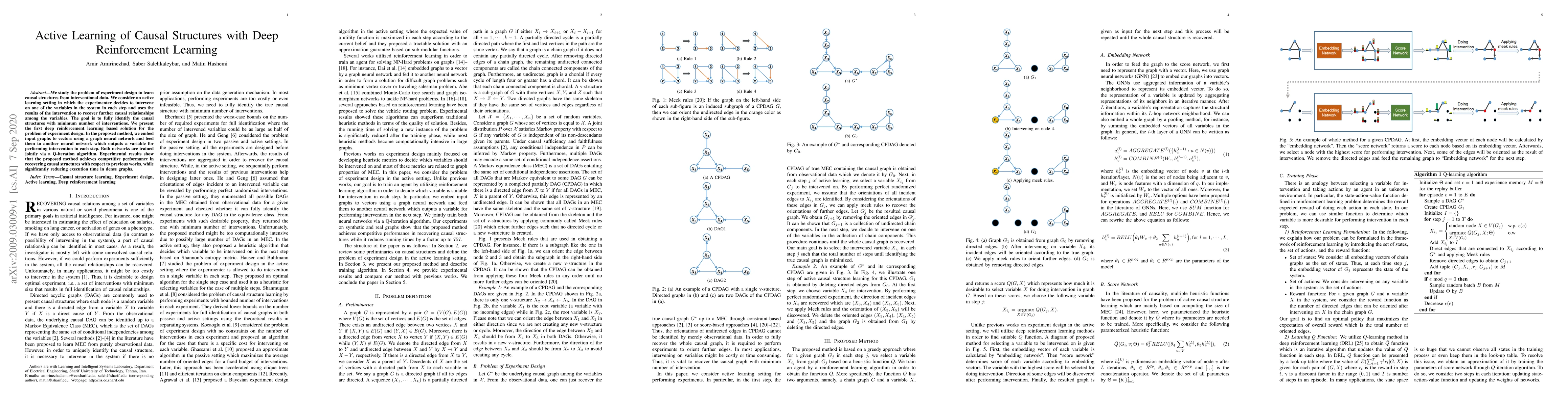 This paper proposes a deep reinforcement learning approach to actively learn causal structures from interventional data by minimizing intervention steps. The method uses graph neural networks to embed input graphs and a Q-iteration algorithm to train neural networks for selecting intervention variables, achieving competitive performance and reduced execution time.