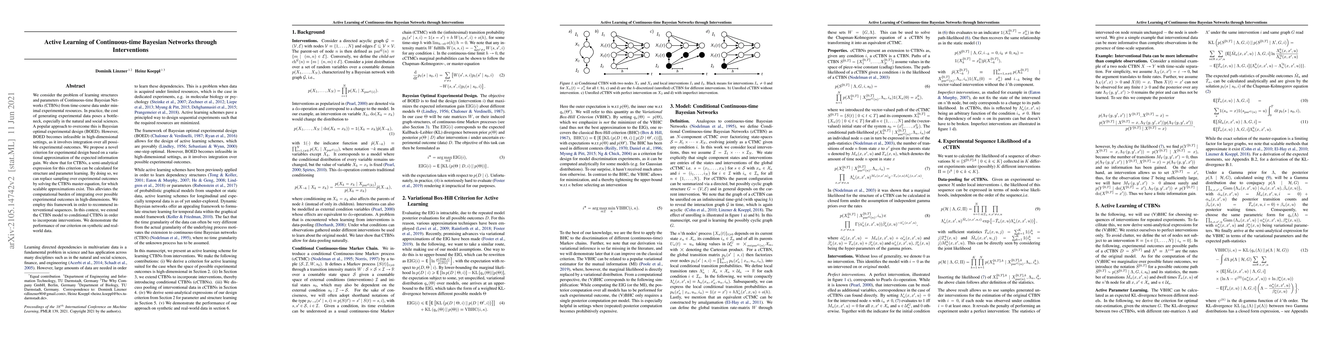 This paper proposes a novel criterion for designing experiments to learn Continuous-time Bayesian Networks (CTBNs) with minimal resources, using a variational approximation to calculate expected information gain. This approach replaces computationally intensive sampling with scalable approximations, enabling efficient structure and parameter learning in high-dimensional settings.