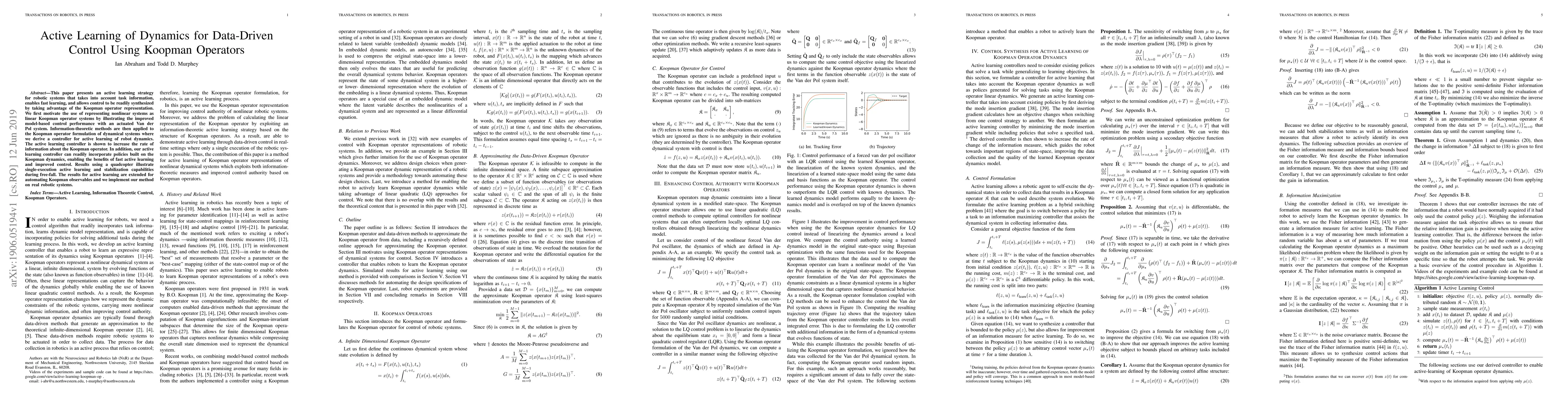 This paper proposes an active learning strategy for robotic systems using Koopman operators to enhance model-based control, demonstrating improved performance through a quadcopter stabilization experiment. The method leverages information-theoretic approaches to derive an active learning controller that efficiently increases knowledge of the Koopman operator and integrates with control policies.