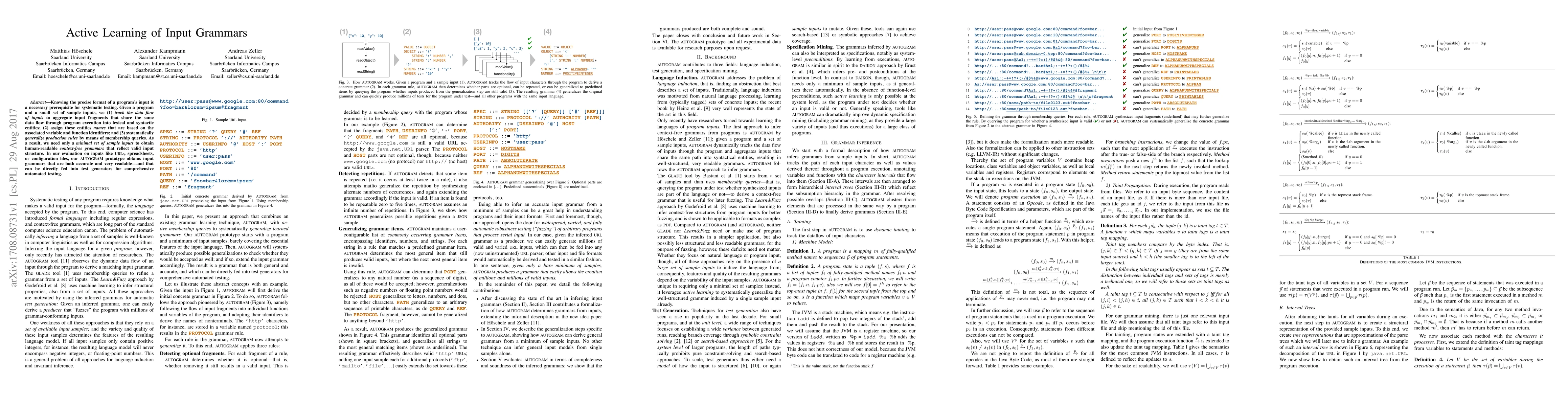 This paper proposes a method for automatically learning context-free grammars from a small set of sample inputs to understand program input formats. The AUTOGRAM prototype aggregates input fragments, assigns names based on identifiers, and generalizes production rules through membership queries, resulting in accurate and readable grammars for automated testing.
