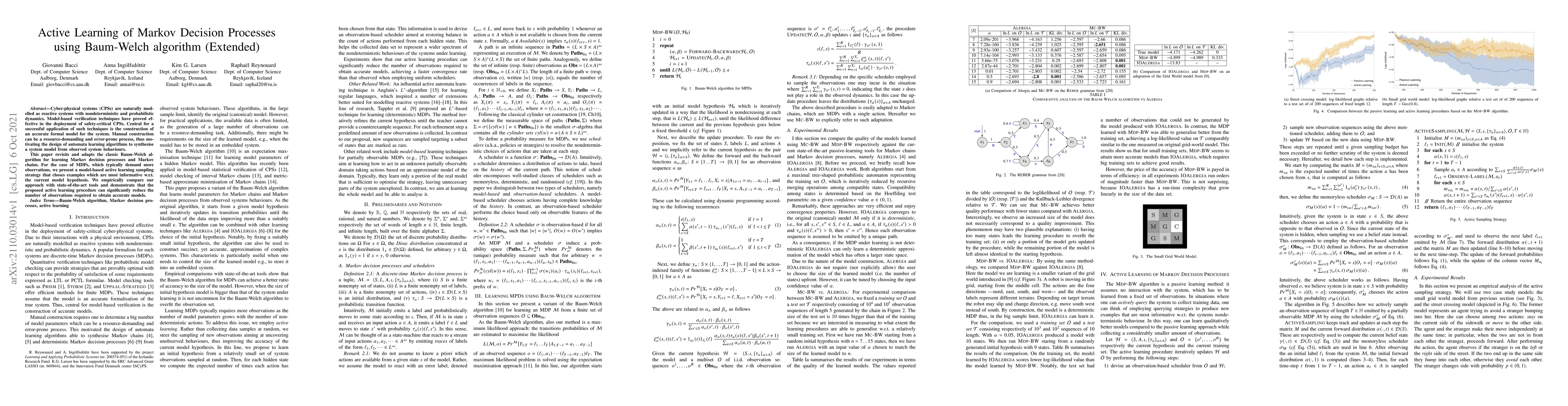 Cyber-physical systems (CPSs) are naturally modelled as reactive systems with nondeterministic and probabilistic dynamics. Model-based verification techniques have proved effective in the deployment of safety-critical CPSs. Central for a successful application of such techniques is the construction of an accurate formal model for the system. Manual construction can be a resource-demanding and error-prone process, thus motivating the design of automata learning algorithms to synthesise a system model from observed system behaviours. This paper revisits and adapts the classic Baum-Welch algorithm for learning Markov decision processes and Markov chains. For the case of MDPs, which typically demand more observations, we present a model-based active learning sampling strategy that choses examples which are most informative w.r.t.\ the current model hypothesis. We empirically compare our approach with state-of-the-art tools and demonstrate that the proposed active learning procedure can significantly reduce the number of observations required to obtain accurate models.