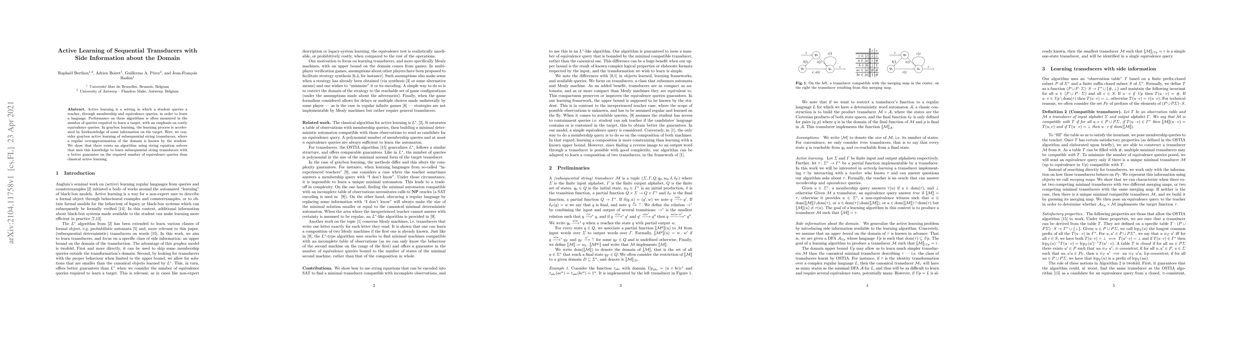 This paper proposes an active learning algorithm for subsequential string transducers that leverages side information about the domain to reduce the number of equivalence queries needed. The approach uses string equation solvers and a known regular overapproximation of the domain to achieve better learning performance compared to classical methods.