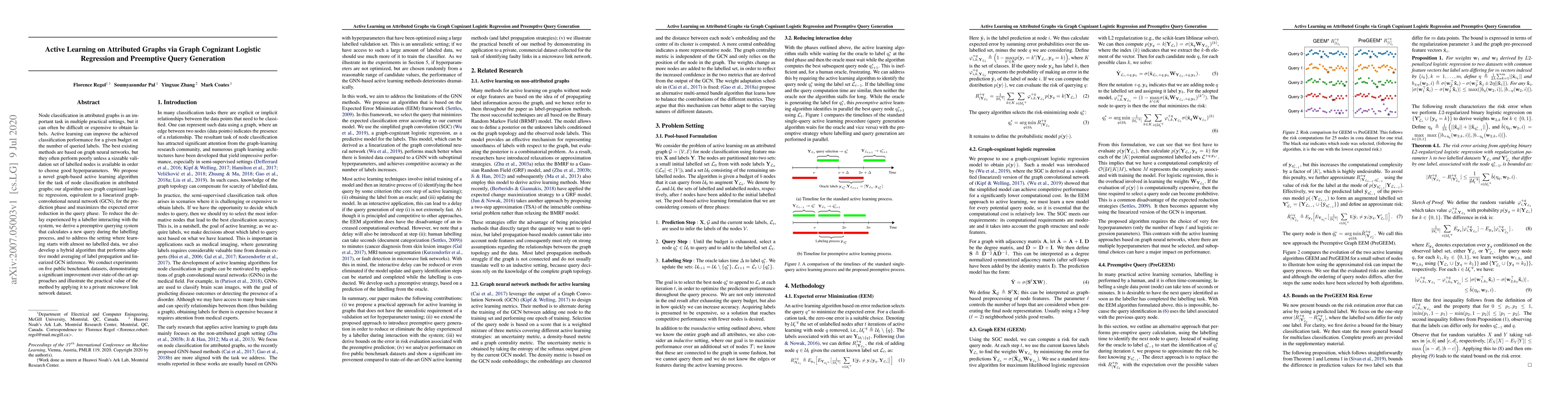Node classification in attributed graphs is an important task in multiple practical settings, but it can often be difficult or expensive to obtain labels. Active learning can improve the achieved classification performance for a given budget on the number of queried labels. The best existing methods are based on graph neural networks, but they often perform poorly unless a sizeable validation set of labelled nodes is available in order to choose good hyperparameters. We propose a novel graph-based active learning algorithm for the task of node classification in attributed graphs; our algorithm uses graph cognizant logistic regression, equivalent to a linearized graph convolutional neural network (GCN), for the prediction phase and maximizes the expected error reduction in the query phase. To reduce the delay experienced by a labeller interacting with the system, we derive a preemptive querying system that calculates a new query during the labelling process, and to address the setting where learning starts with almost no labelled data, we also develop a hybrid algorithm that performs adaptive model averaging of label propagation and linearized GCN inference. We conduct experiments on five public benchmark datasets, demonstrating a significant improvement over state-of-the-art approaches and illustrate the practical value of the method by applying it to a private microwave link network dataset.