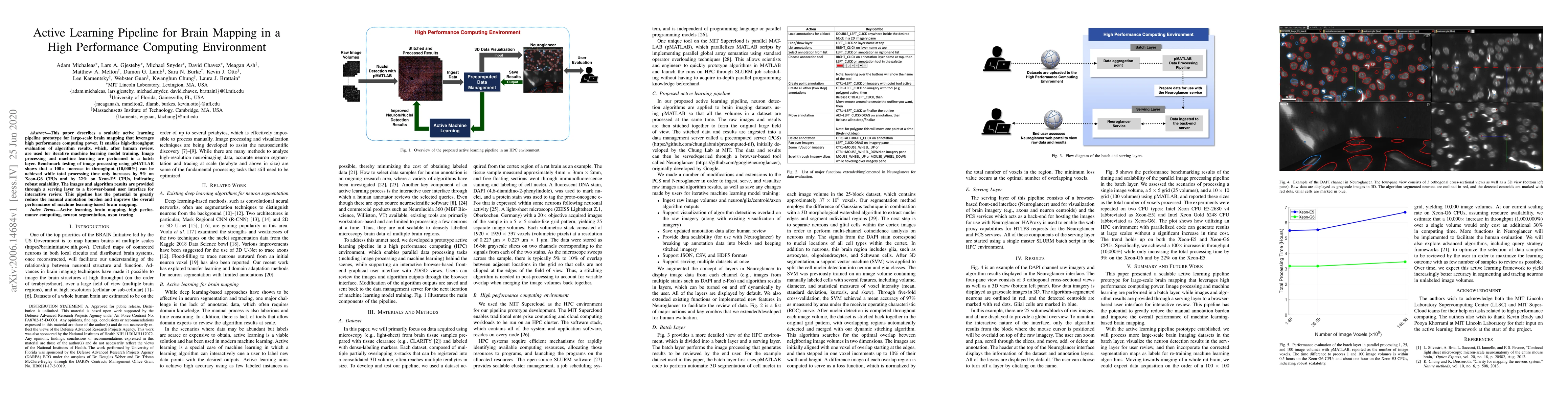 This paper describes a scalable active learning pipeline prototype for large-scale brain mapping that leverages high performance computing power. It enables high-throughput evaluation of algorithm results, which, after human review, are used for iterative machine learning model training. Image processing and machine learning are performed in a batch layer. Benchmark testing of image processing using pMATLAB shows that a 100$\times$ increase in throughput (10,000%) can be achieved while total processing time only increases by 9% on Xeon-G6 CPUs and by 22% on Xeon-E5 CPUs, indicating robust scalability. The images and algorithm results are provided through a serving layer to a browser-based user interface for interactive review. This pipeline has the potential to greatly reduce the manual annotation burden and improve the overall performance of machine learning-based brain mapping.
