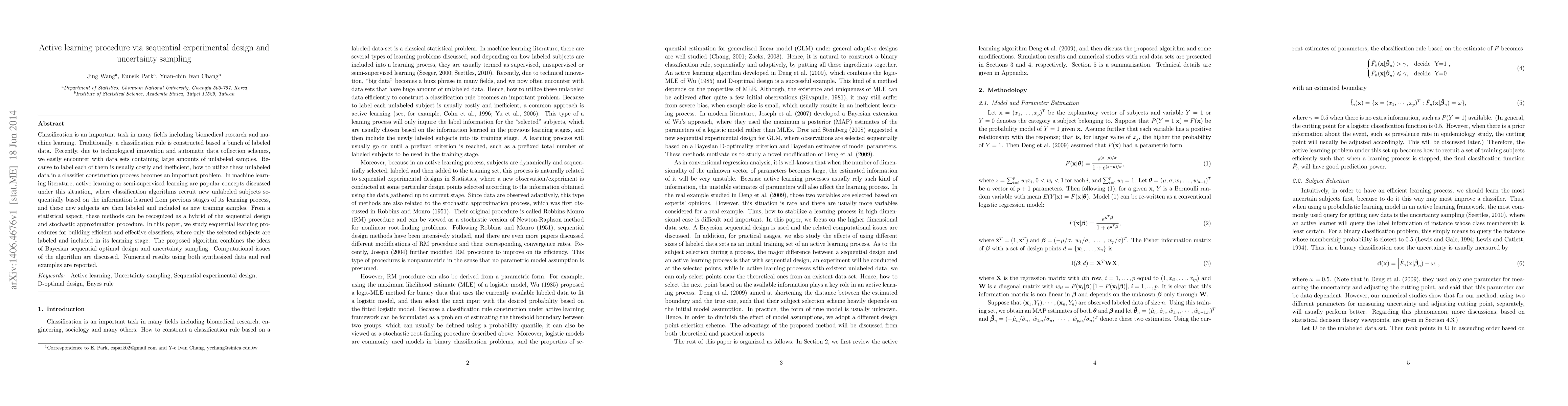 This paper explores active learning techniques for constructing efficient classifiers using sequential design and uncertainty sampling. It proposes an algorithm that selectively labels and incorporates unlabeled data to improve classification, demonstrating its effectiveness through synthesized and real-world data examples.