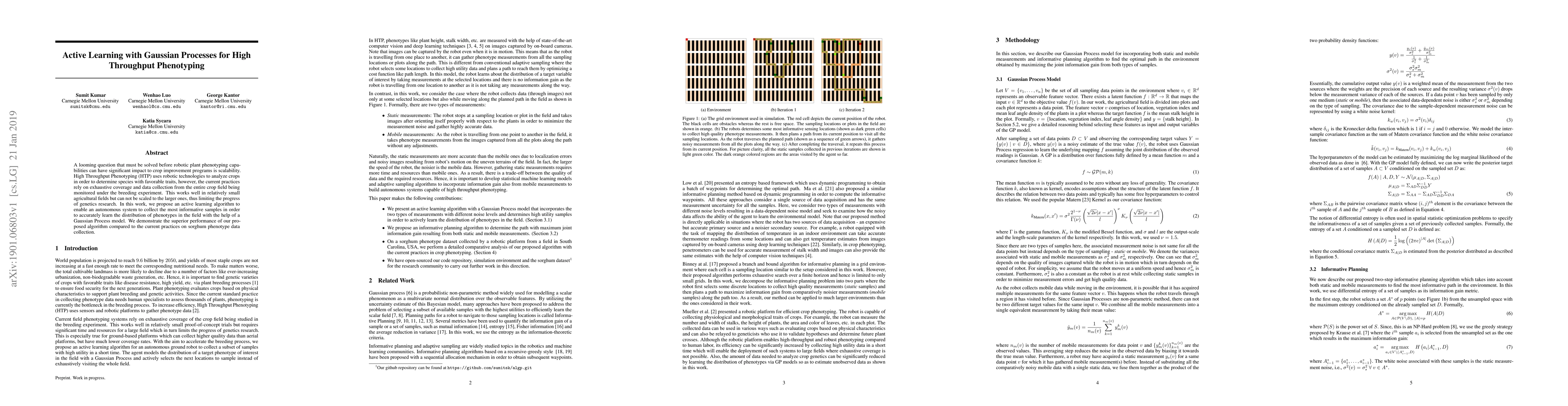 This paper proposes an active learning algorithm using Gaussian Processes to enhance scalability in High Throughput Phenotyping for crop improvement. The method aims to collect the most informative samples autonomously, demonstrating superior performance over traditional exhaustive data collection methods using sorghum phenotype data.