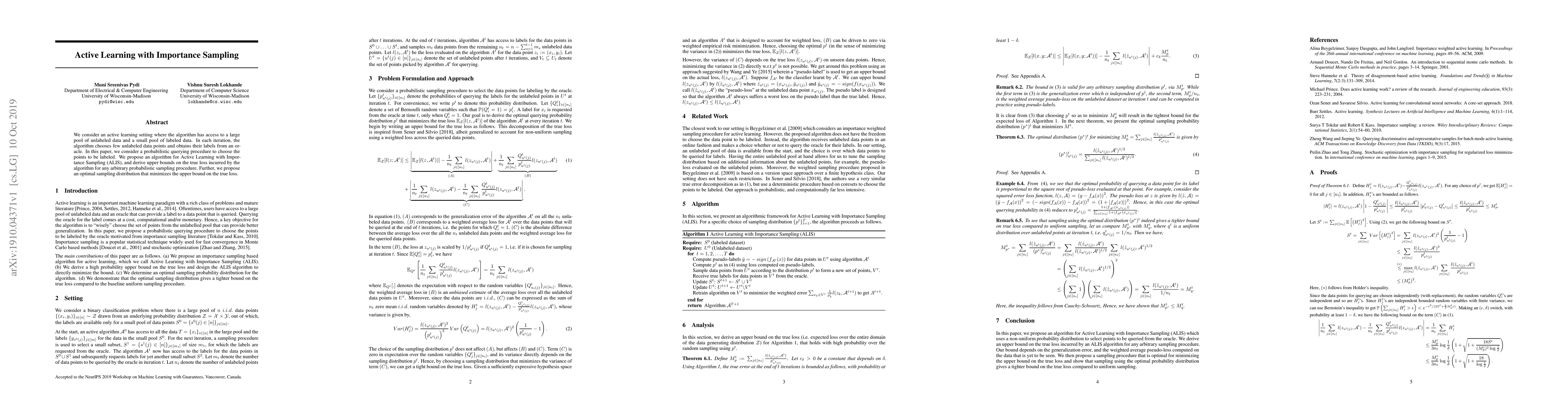 This paper proposes an Active Learning with Importance Sampling (ALIS) algorithm to efficiently query unlabeled data in an active learning setting. It derives upper bounds on the true loss and introduces an optimal sampling distribution to minimize this loss.