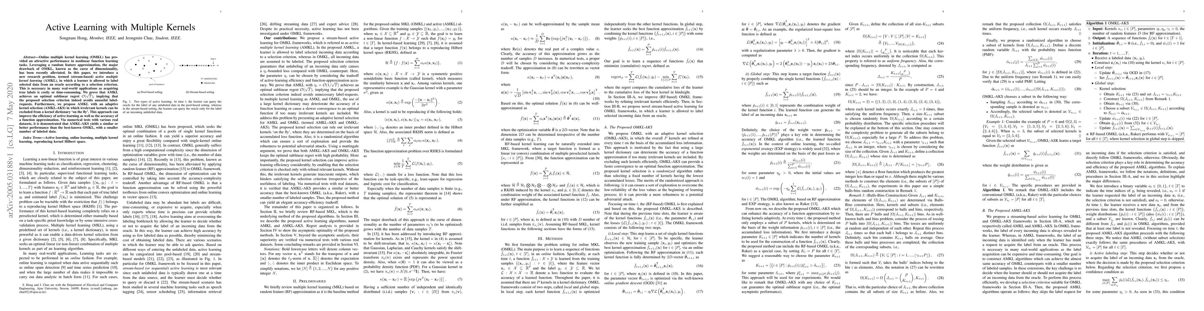 This paper introduces active multiple kernel learning (AMKL) to address the challenge of costly label acquisition in real-world applications, achieving optimal sublinear regret. It also proposes an adaptive kernel selection method (AMKL-AKS) that dynamically excludes irrelevant kernels, improving both efficiency and accuracy, as demonstrated by superior performance in real datasets.