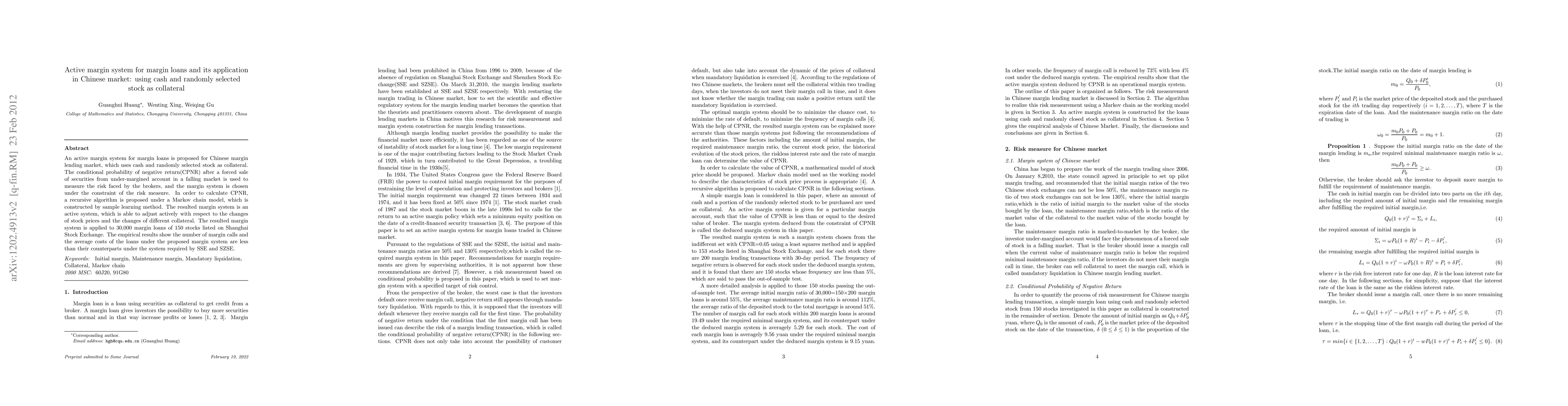 An active margin system for margin loans is proposed for Chinese margin lending market, which uses cash and randomly selected stock as collateral. The conditional probability of negative return(CPNR) after a forced sale of securities from under-margined account in a falling market is used to measure the risk faced by the brokers, and the margin system is chosen under the constraint of the risk measure. In order to calculate CPNR, a recursive algorithm is proposed under a Markov chain model, which is constructed by sample learning method. The resulted margin system is an active system, which is able to adjust actively with respect to the changes of stock prices and the changes of different collateral. The resulted margin system is applied to 30,000 margin loans of 150 stocks listed on Shanghai Stock Exchange. The empirical results show the number of margin calls and the average costs of the loans under the proposed margin system are less than their counterparts under the system required by SSE and SZSE.
