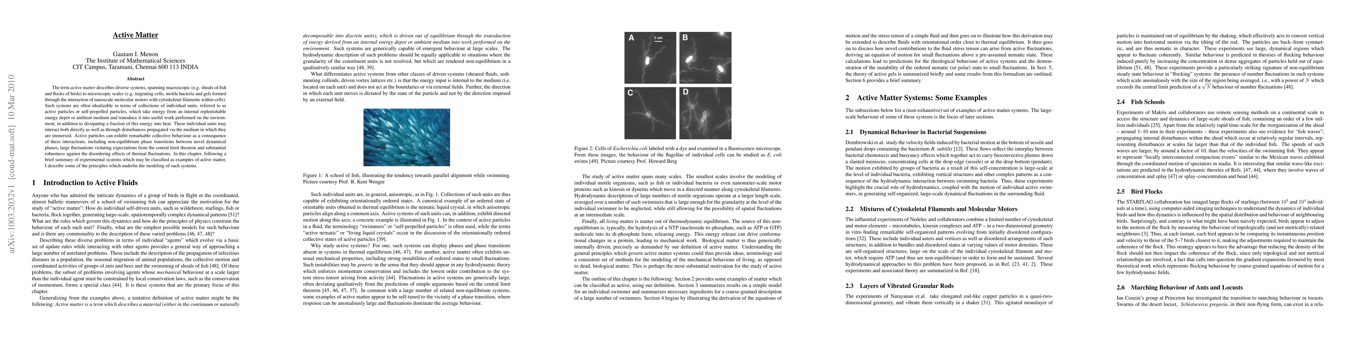 This paper explores the concept of active matter, encompassing diverse systems from macroscopic to microscopic scales, characterized by self-propelled particles that convert energy into work. It highlights the collective behaviors and non-equilibrium dynamics exhibited by these systems, and outlines principles for modeling such phenomena.