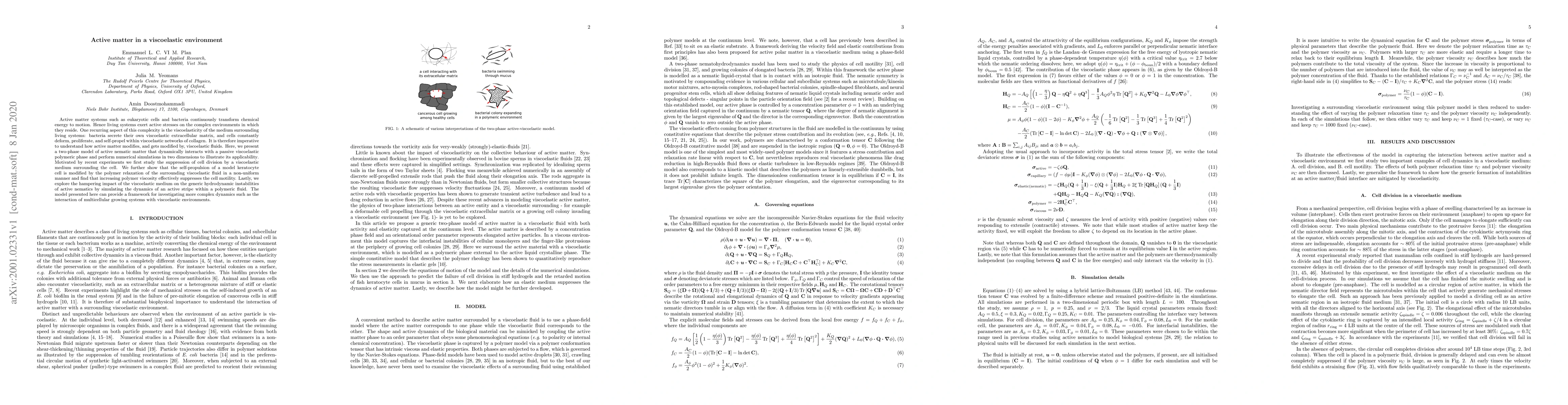 This paper investigates how active matter, like eukaryotic cells and bacteria, interacts with viscoelastic environments, using a two-phase model of active nematic matter and a passive viscoelastic polymer phase. The study finds that viscoelastic mediums can suppress cell division and motility, and can also impact the hydrodynamic instabilities of active nematics.