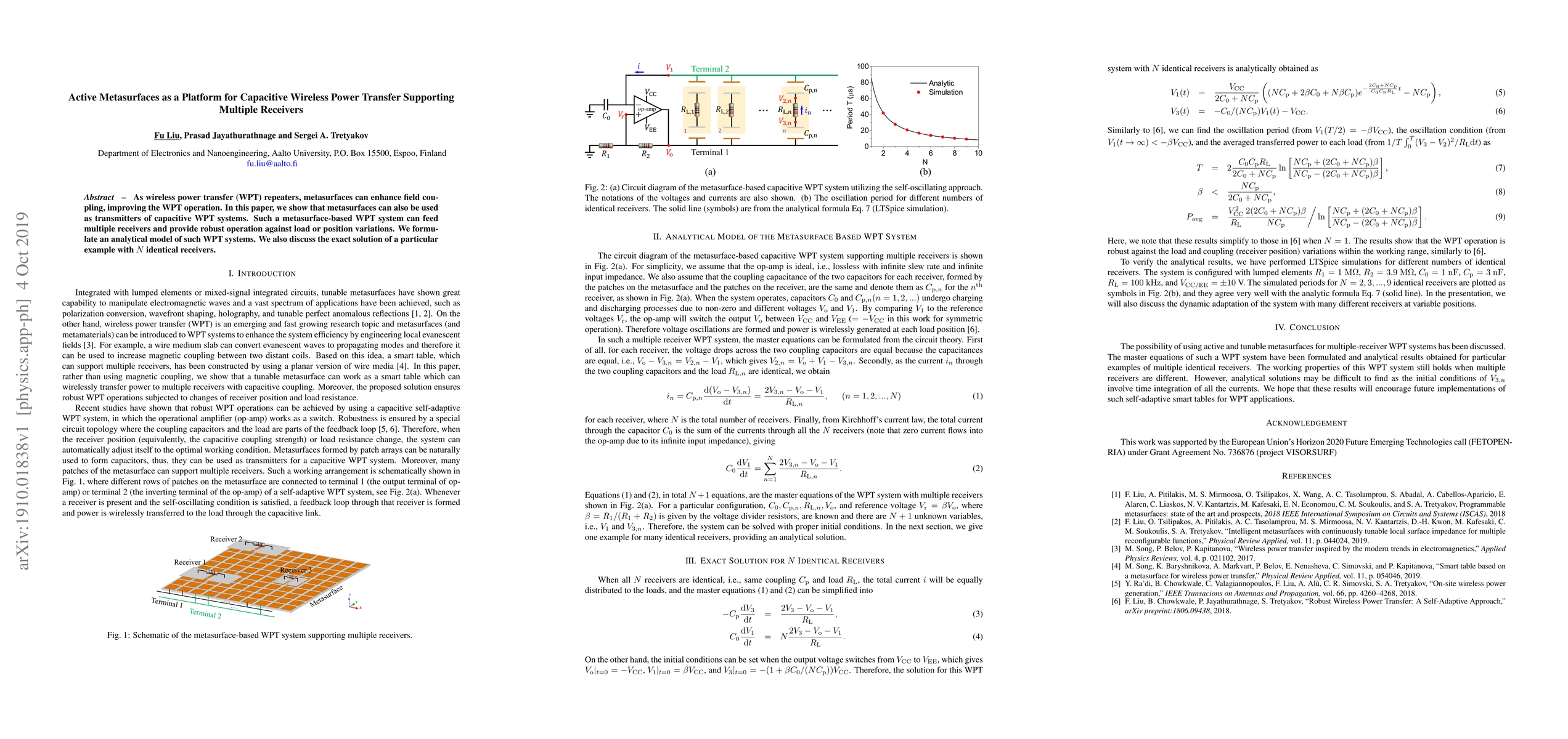 As wireless power transfer (WPT) repeaters, metasurfaces can enhance field coupling, improving the WPT operation. In this paper, we show that metasurfaces can also be used as transmitters of capacitive WPT systems. Such a metasurface-based WPT system can feed multiple receivers and provide robust operation against load or position variations. We formulate an analytical model of such WPT systems. We also discuss the exact solution of a particular example with $N$ identical receivers.