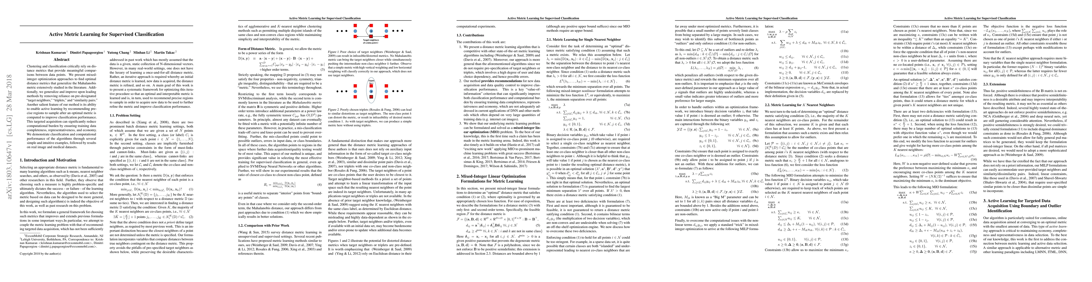 Clustering and classification critically rely on distance metrics that provide meaningful comparisons between data points. We present mixed-integer optimization approaches to find optimal distance metrics that generalize the Mahalanobis metric extensively studied in the literature. Additionally, we generalize and improve upon leading methods by removing reliance on pre-designated "target neighbors," "triplets," and "similarity pairs." Another salient feature of our method is its ability to enable active learning by recommending precise regions to sample after an optimal metric is computed to improve classification performance. This targeted acquisition can significantly reduce computational burden by ensuring training data completeness, representativeness, and economy. We demonstrate classification and computational performance of the algorithms through several simple and intuitive examples, followed by results on real image and medical datasets.