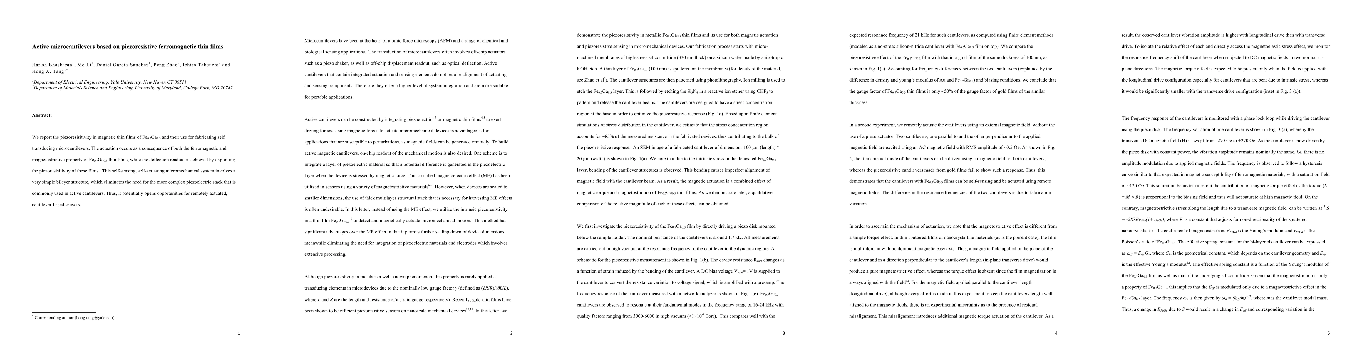 We report the piezoresisitivity in magnetic thin films of FeGa and their use for fabricating self transducing microcantilevers. The actuation occurs as a consequence of both the ferromagnetic and magnetostrictive property of FeGa thin films, while the deflection readout is achieved by exploiting the piezoresisitivity of these films. This self-sensing, self-actuating micromechanical system involves a very simple bilayer structure, which eliminates the need for the more complex piezoelectric stack that is commonly used in active cantilevers. Thus, it potentially opens opportunities for remotely actuated, cantilever-based sensors.