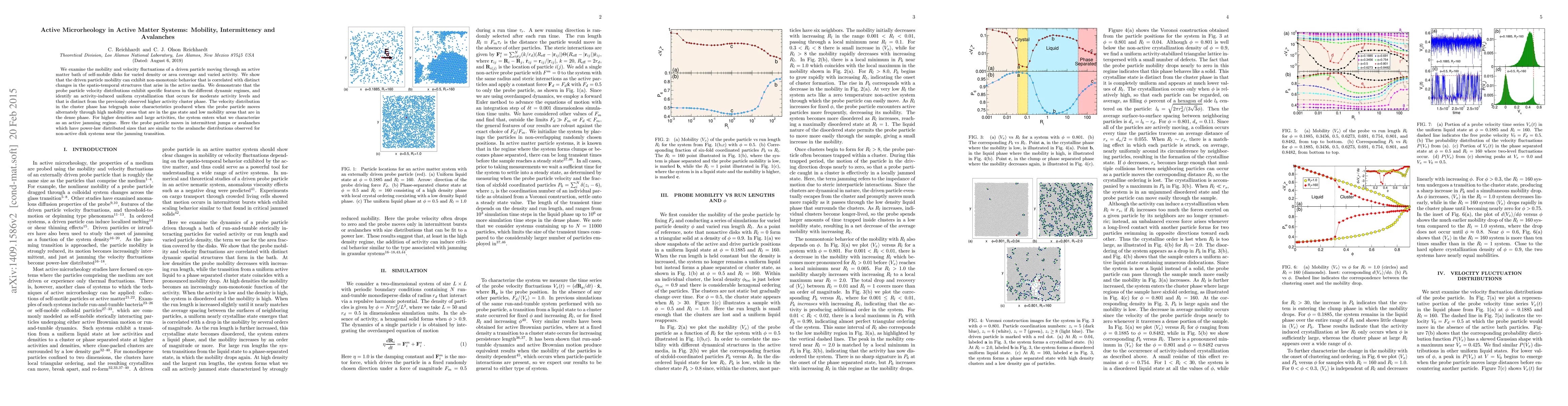 This paper explores the mobility and velocity fluctuations of a driven particle in an active matter system composed of self-mobile disks, revealing non-monotonic mobility correlated with structural changes in the active media. It identifies distinct dynamic regimes, including an activity-induced crystallization, a cluster phase with telegraph noise, and an active jamming regime characterized by intermittent jumps and power-law distributed avalanches.