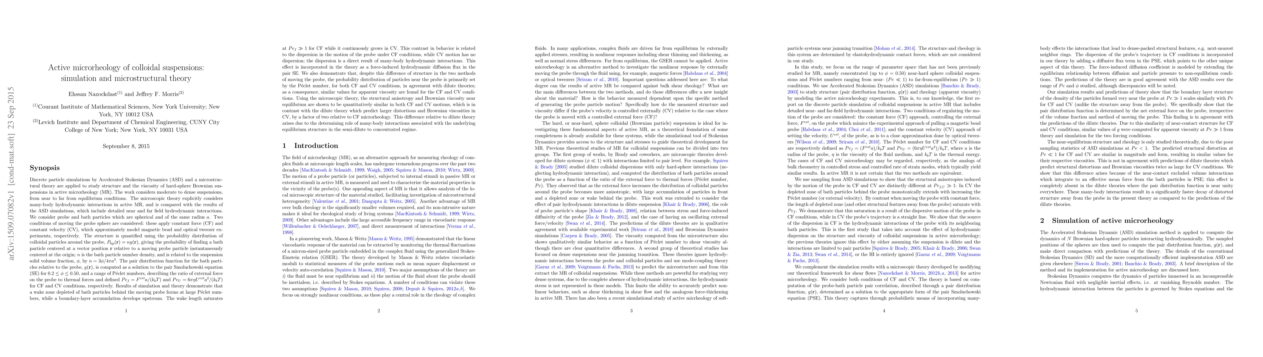 The paper presents a microstructural theory that incorporates many-body hydrodynamic interactions in active microrheology, providing a detailed comparison with ASD simulations and offering insights into the structure and viscosity of colloidal suspensions under various flow conditions.