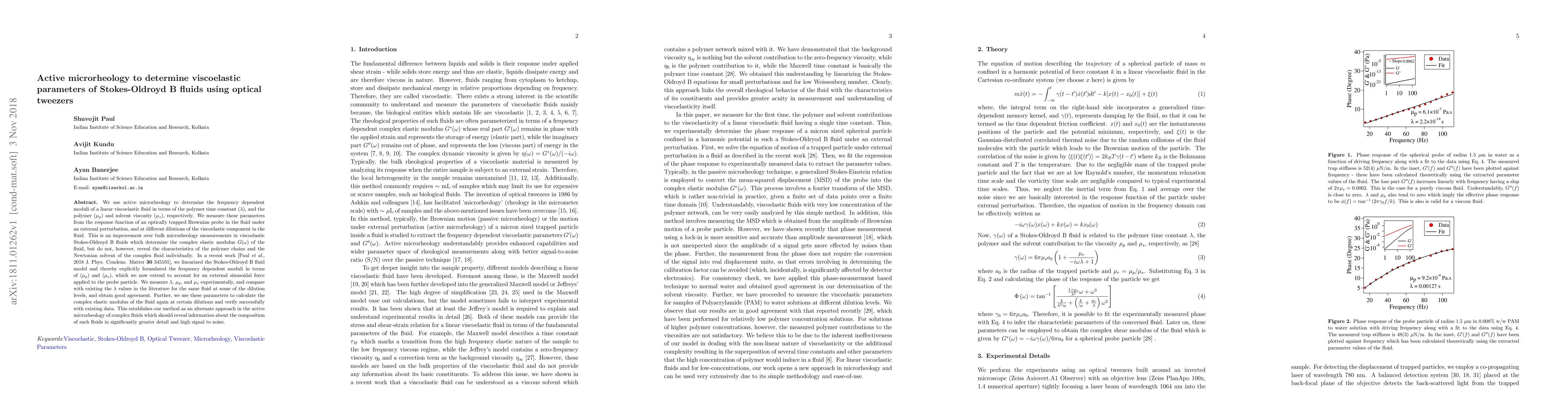 This paper employs active microrheology with optical tweezers to measure the viscoelastic properties of Stokes-Oldroyd B fluids, determining the polymer time constant and viscosities of both polymer and solvent. This method provides detailed insights into the fluid's composition compared to bulk microrheology.