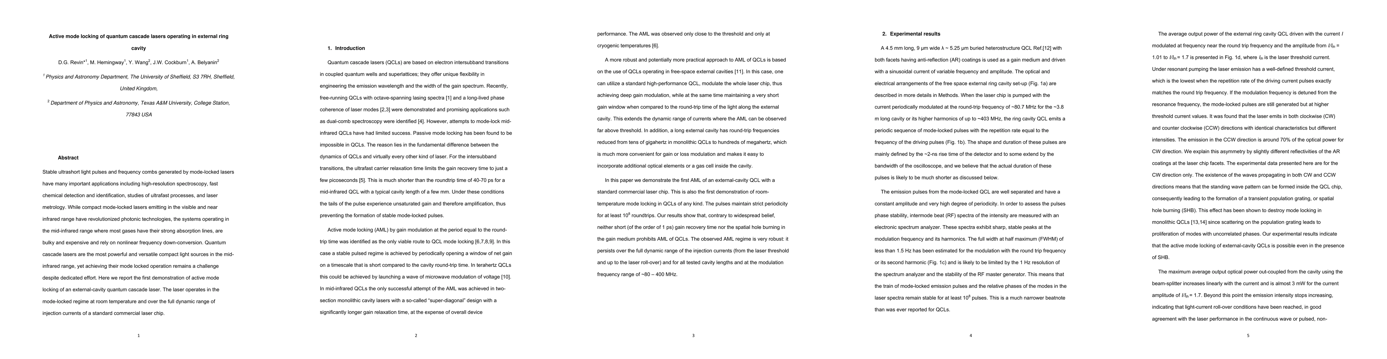This paper demonstrates the first active mode locking of an external-cavity quantum cascade laser, enabling stable ultrashort light pulses and frequency combs at room temperature. This breakthrough addresses the challenge of compact, mid-infrared mode-locked lasers, which are crucial for high-resolution spectroscopy and fast chemical detection.
