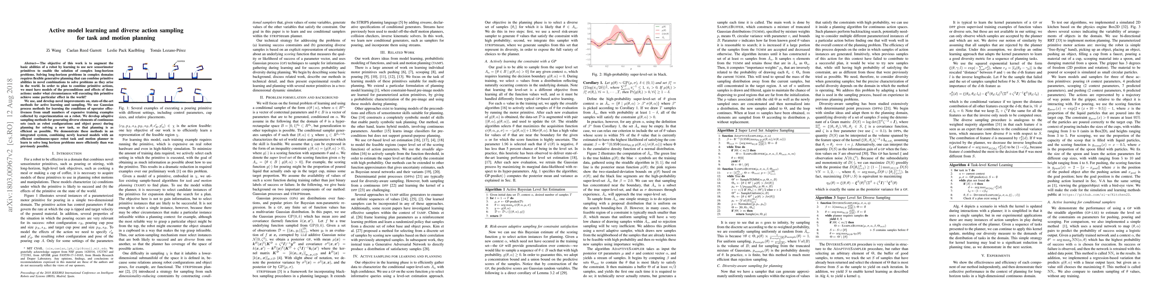 This paper proposes active model learning and diverse action sampling techniques to enhance a robot's ability to solve complex, long-horizon problems by learning new sensorimotor primitives. It combines Gaussian process methods for effective action modeling and adaptive sampling for efficient planning, demonstrating improved performance in task and motion planning.