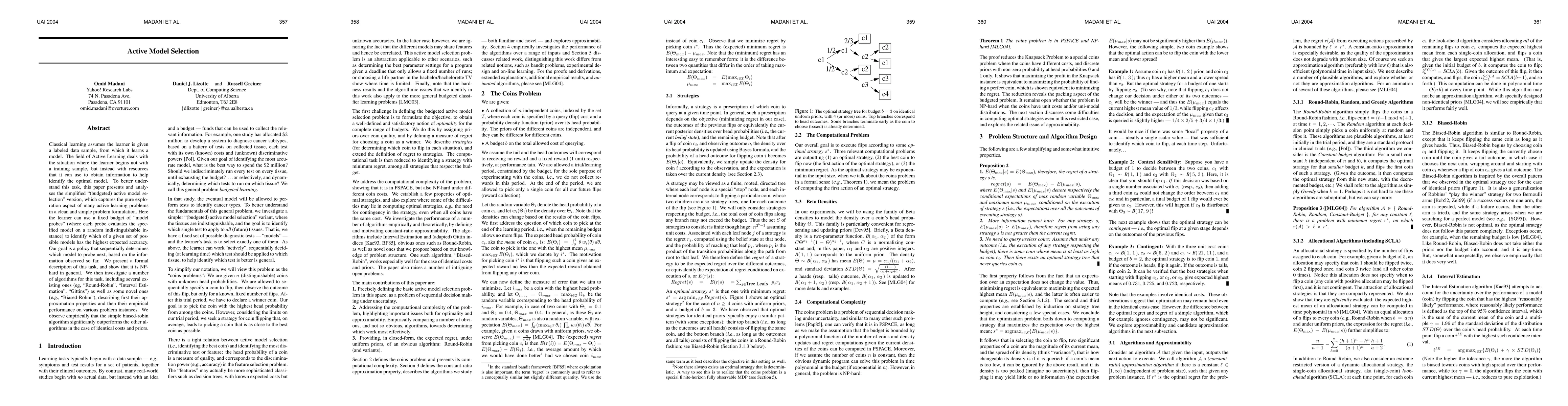 The paper formalizes the active model selection problem, proves its NP-hardness, and presents several algorithms with varying approximation properties and empirical performance.