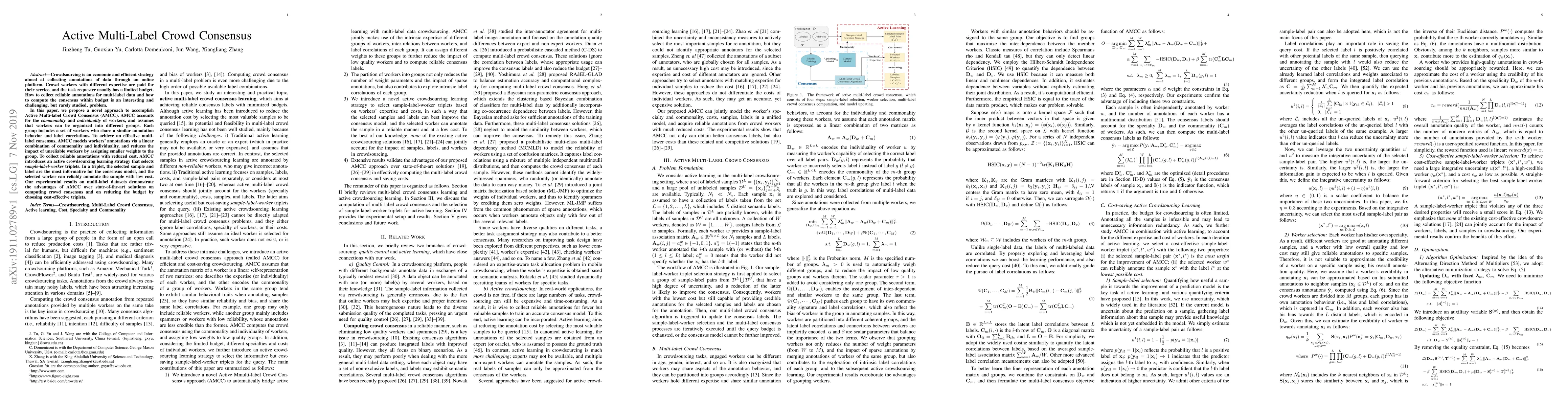 This paper proposes Active Multi-Label Crowd Consensus (AMCC), a novel approach to collecting reliable annotations from crowdsourced workers while reducing costs. It achieves this through an active learning strategy that selects informative triplets of samples, labels, and workers for cost-effective annotation.