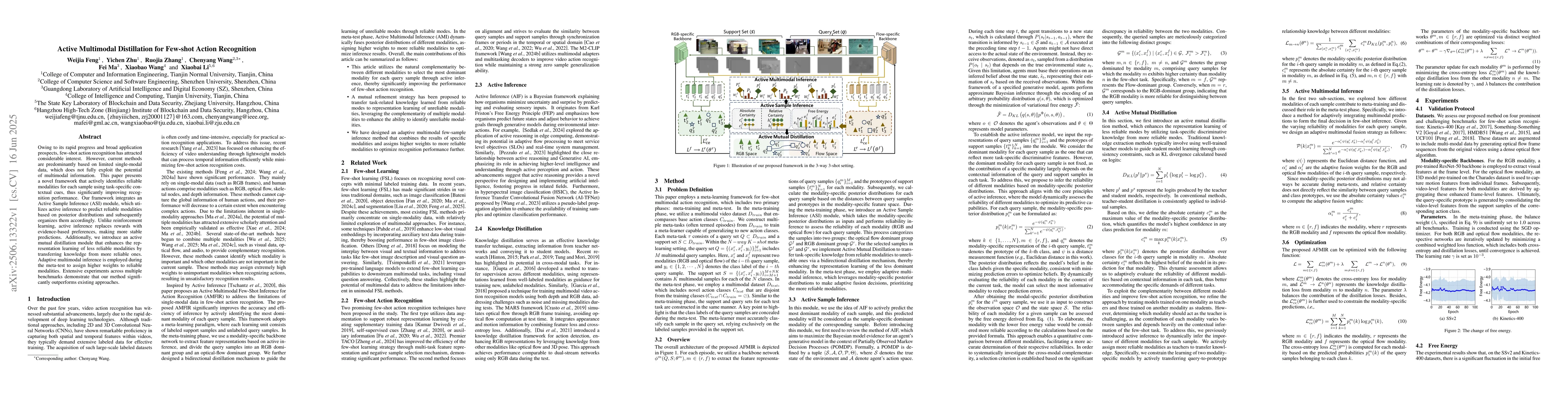 The paper presents a novel framework, AFMIR, for few-shot action recognition that actively identifies reliable modalities using task-specific contextual cues. It integrates an Active Sample Inference (ASI) module for evidence-based modality predictions and an Active Mutual Distillation module for enhancing representation learning of less reliable modalities.