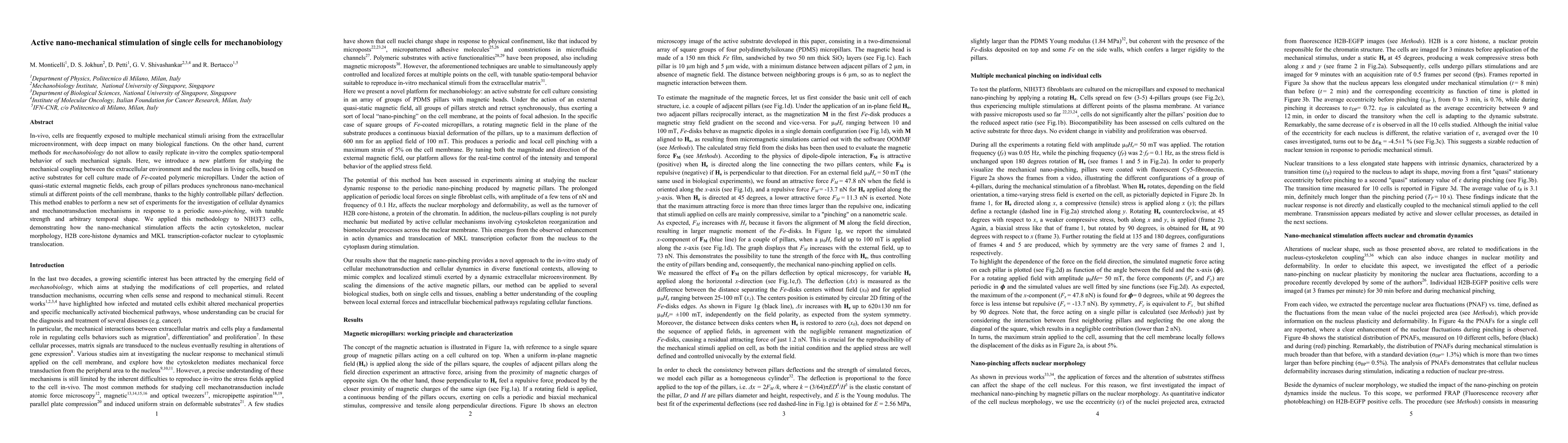 In-vivo, cells are frequently exposed to multiple mechanical stimuli arising from the extracellular microenvironment, with deep impact on many biological functions. On the other hand, current methods for mechanobiology do not allow to easily replicate in-vitro the complex spatio-temporal behavior of such mechanical signals. Here, we introduce a new platform for studying the mechanical coupling between the extracellular environment and the nucleus in living cells, based on active substrates for cell culture made of Fe-coated polymeric micropillars. Under the action of quasi-static external magnetic fields, each group of pillars produces synchronous nano-mechanical stimuli at different points of the cell membrane, thanks to the highly controllable pillars' deflection. This method enables to perform a new set of experiments for the investigation of cellular dynamics and mechanotransduction mechanisms in response to a periodic nano-pinching, with tunable strength and arbitrary temporal shape. We applied this methodology to NIH3T3 cells, demonstrating how the nano-mechanical stimulation affects the actin cytoskeleton, nuclear morphology, H2B core-histone dynamics and MKL transcription-cofactor nuclear to cytoplasmic translocation.