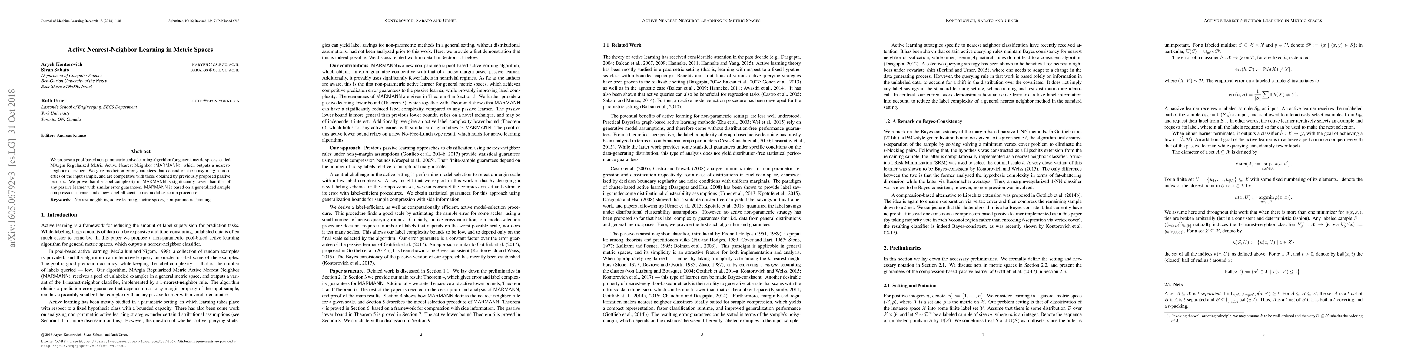This paper introduces MARMANN, an active learning algorithm for metric spaces that selects the most informative samples to label, achieving lower label complexity compared to passive learners while maintaining competitive prediction error guarantees. The method leverages a generalized sample compression and an efficient active model-selection procedure.