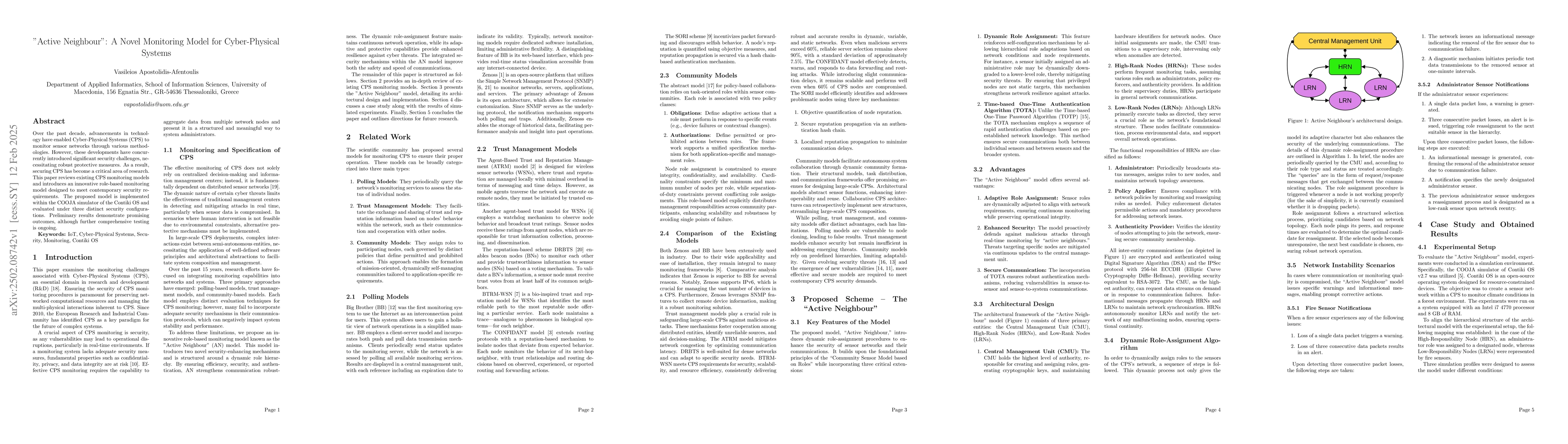 The 'Active Neighbour' model, with its dynamic role assignment, Time-based One-Time Authentication Algorithm (TOTA), and architectural design consisting of Central Management Unit (CMU), High-Rank Nodes (HRNs), and Low-Rank Nodes (LRNs), presents a novel approach to CPS security.