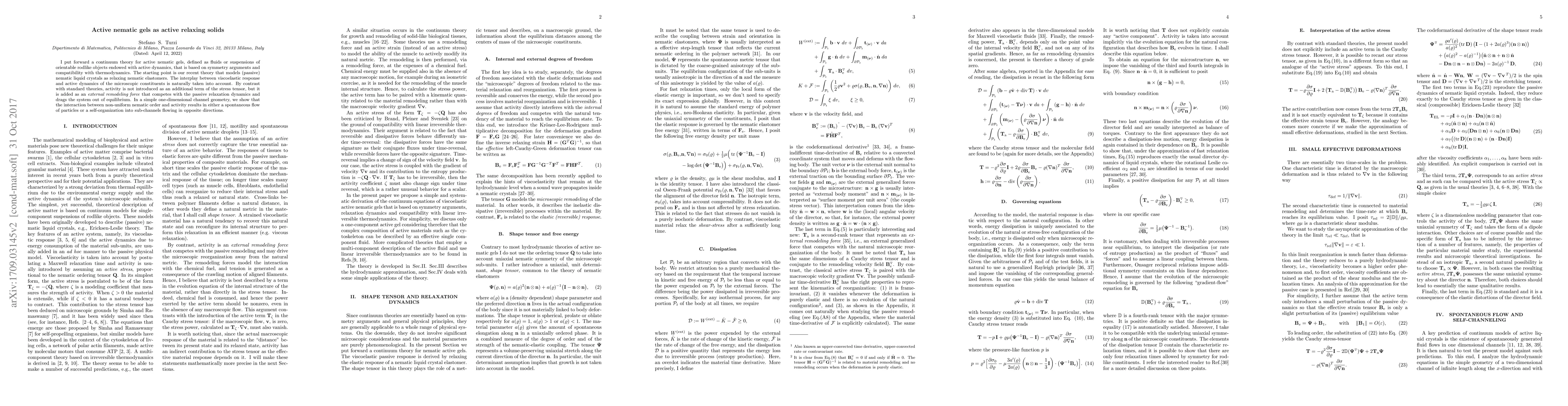 The paper introduces a thermodynamically consistent theory for active nematic gels, embedding viscoelasticity and introducing activity as a remodeling force, eliminating the need for explicit active stress terms.