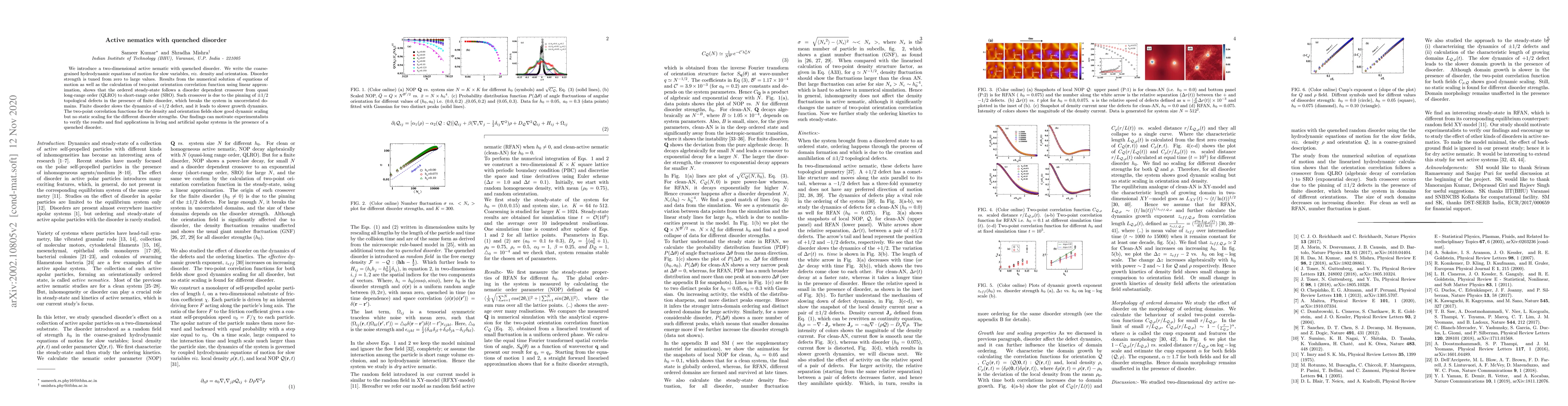 We introduce a two-dimensional active nematic with quenched disorder. We write the coarse-grained hydrodynamic equations of motion for slow variables, viz. density, and orientation. Disorder strength is tuned from zero to large values. Results from the numerical solution of equations of motion as well as the calculation of two-point orientation correlation function using linear approximation show that the ordered steady-state follows a disorder-dependent crossover from quasi long-range order (QLRO) to short-range order (SRO). Such crossover is due to the pinning of +1/2 and -1/2 topological defects in the presence of finite disorder, which breaks the system in uncorrelated domains. Finite disorder slows the dynamics of +1/2 defect, and it leads to slower growth dynamics. The two-point correlation functions for the density and orientation fields show good dynamic scaling but no static scaling for the different disorder strengths. Our findings can motivate experimentalists to verify the results and find applications in living and artificial apolar systems in the presence of a quenched disorder.