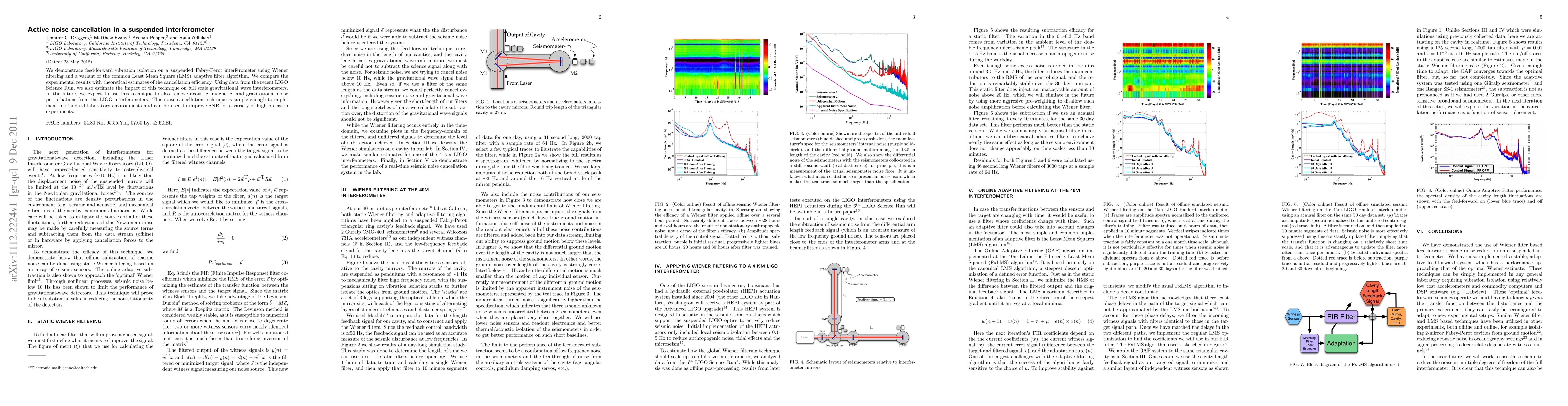 This paper demonstrates a method for active noise cancellation using Wiener filtering and an adaptive filter algorithm to isolate a suspended interferometer from vibrations. The technique is shown to improve the signal-to-noise ratio and is projected to benefit full-scale gravitational wave detectors like LIGO.