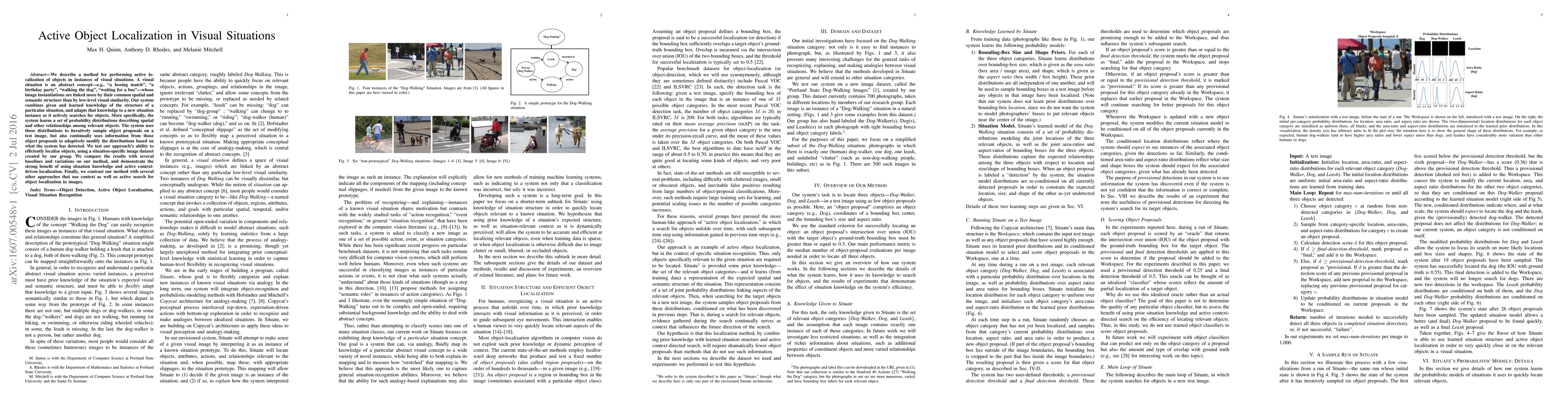 We describe a method for performing active localization of objects in instances of visual situations. A visual situation is an abstract concept---e.g., "a boxing match", "a birthday party", "walking the dog", "waiting for a bus"---whose image instantiations are linked more by their common spatial and semantic structure than by low-level visual similarity. Our system combines given and learned knowledge of the structure of a particular situation, and adapts that knowledge to a new situation instance as it actively searches for objects. More specifically, the system learns a set of probability distributions describing spatial and other relationships among relevant objects. The system uses those distributions to iteratively sample object proposals on a test image, but also continually uses information from those object proposals to adaptively modify the distributions based on what the system has detected. We test our approach's ability to efficiently localize objects, using a situation-specific image dataset created by our group. We compare the results with several baselines and variations on our method, and demonstrate the strong benefit of using situation knowledge and active context-driven localization. Finally, we contrast our method with several other approaches that use context as well as active search for object localization in images.