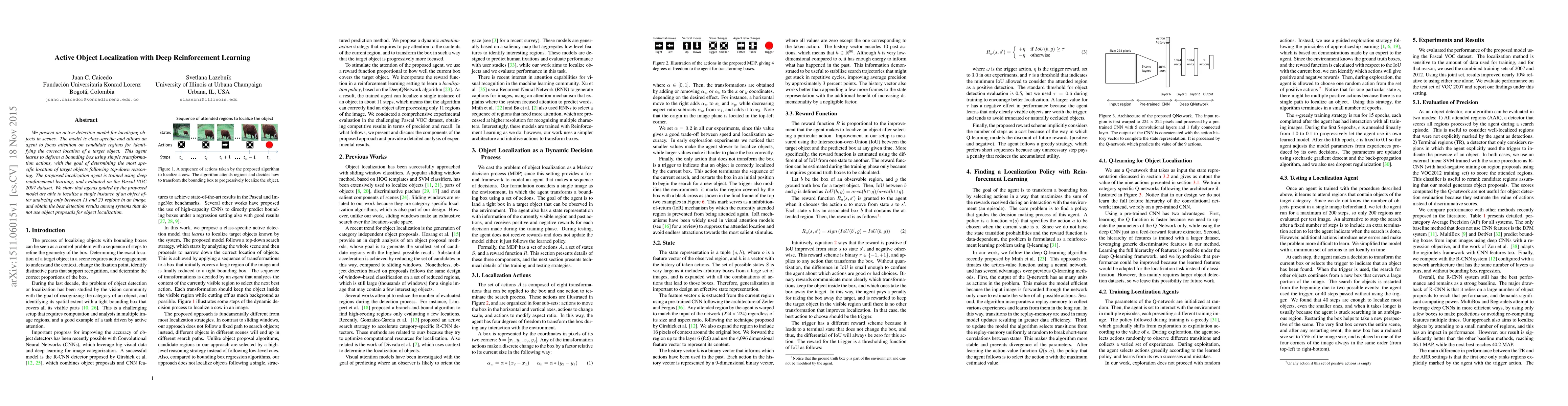 This paper introduces an active object localization model using deep reinforcement learning that enables an agent to focus on candidate regions to identify the precise location of target objects. The model outperforms other localization systems by analyzing only a small subset of image regions, achieving superior detection results on the Pascal VOC 2007 dataset.