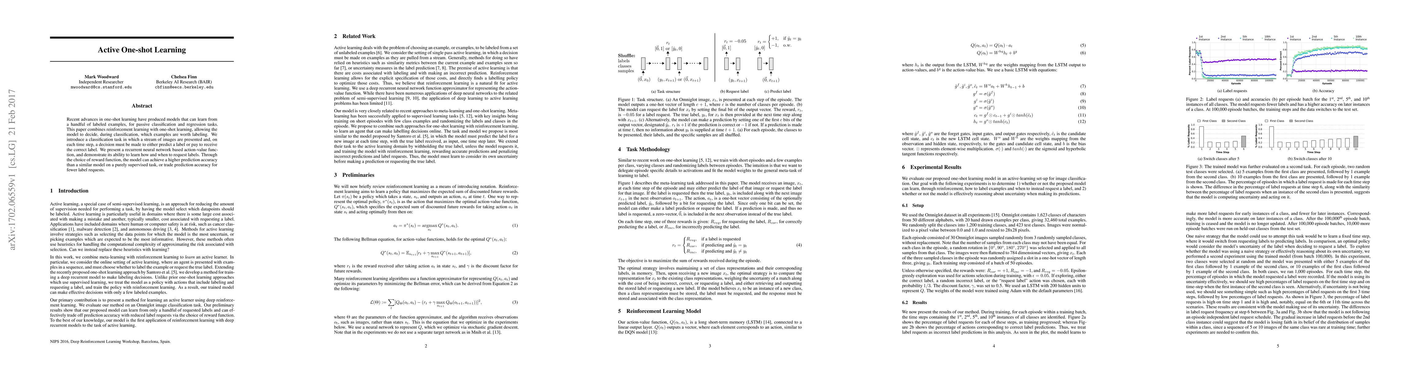 Recent advances in one-shot learning have produced models that can learn from a handful of labeled examples, for passive classification and regression tasks. This paper combines reinforcement learning with one-shot learning, allowing the model to decide, during classification, which examples are worth labeling. We introduce a classification task in which a stream of images are presented and, on each time step, a decision must be made to either predict a label or pay to receive the correct label. We present a recurrent neural network based action-value function, and demonstrate its ability to learn how and when to request labels. Through the choice of reward function, the model can achieve a higher prediction accuracy than a similar model on a purely supervised task, or trade prediction accuracy for fewer label requests.