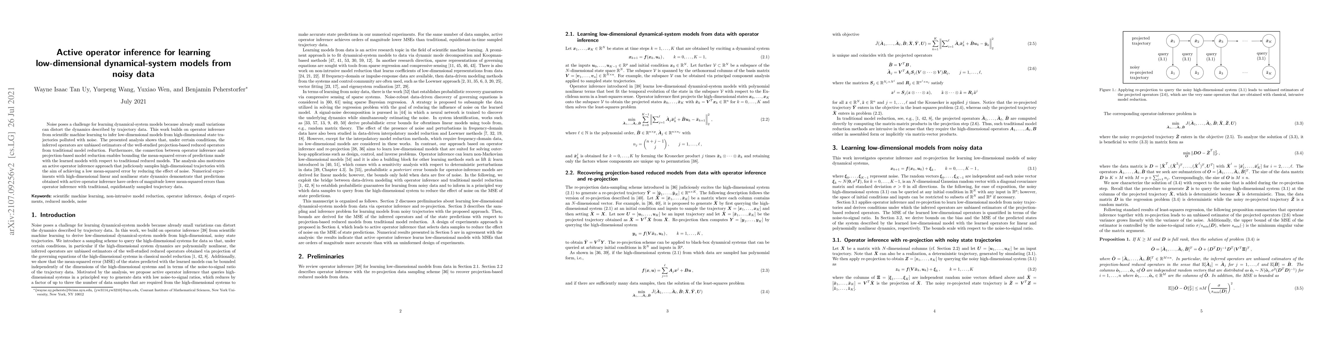 Noise poses a challenge for learning dynamical-system models because already small variations can distort the dynamics described by trajectory data. This work builds on operator inference from scientific machine learning to infer low-dimensional models from high-dimensional state trajectories polluted with noise. The presented analysis shows that, under certain conditions, the inferred operators are unbiased estimators of the well-studied projection-based reduced operators from traditional model reduction. Furthermore, the connection between operator inference and projection-based model reduction enables bounding the mean-squared errors of predictions made with the learned models with respect to traditional reduced models. The analysis also motivates an active operator inference approach that judiciously samples high-dimensional trajectories with the aim of achieving a low mean-squared error by reducing the effect of noise. Numerical experiments with high-dimensional linear and nonlinear state dynamics demonstrate that predictions obtained with active operator inference have orders of magnitude lower mean-squared errors than operator inference with traditional, equidistantly sampled trajectory data.