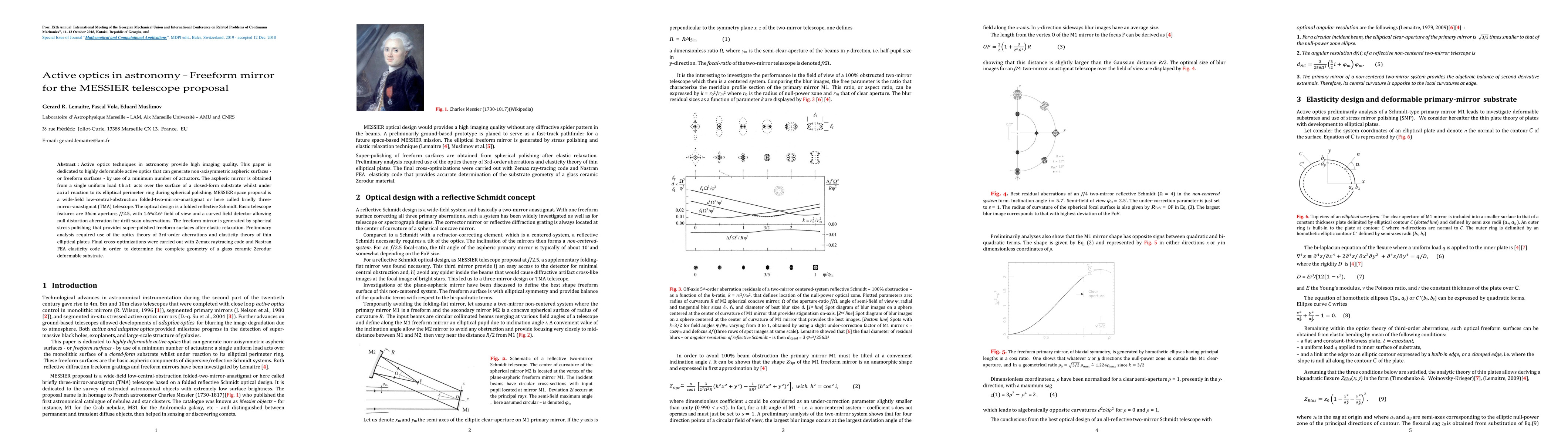 This paper proposes an active optics system for the MESSIER telescope using a freeform mirror to achieve high imaging quality with minimal actuators. The freeform mirror is created through spherical stress polishing, utilizing Zemax and Nastran FEA for final geometry optimization.