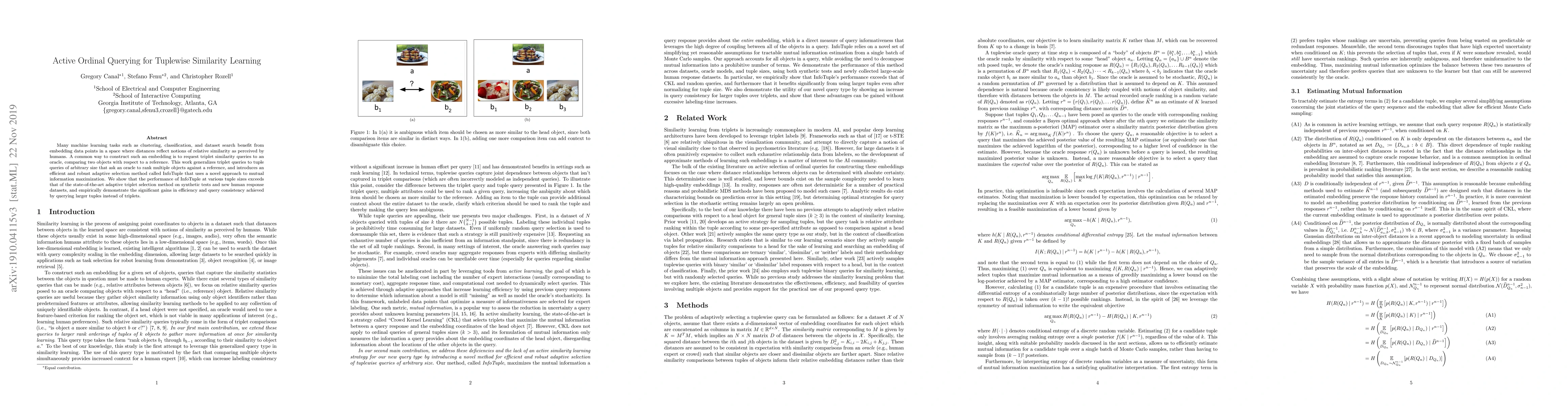 This paper introduces InfoTuple, an adaptive selection method that maximizes mutual information for tuplewise similarity learning, outperforming state-of-the-art triplet methods in efficiency and query consistency.