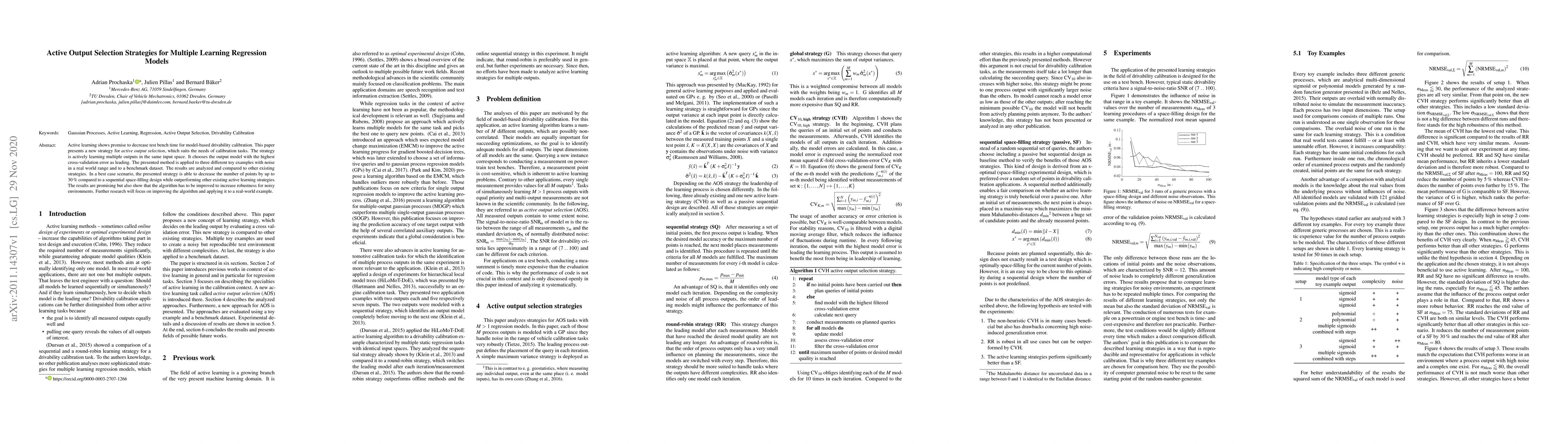 Active learning shows promise to decrease test bench time for model-based drivability calibration. This paper presents a new strategy for active output selection, which suits the needs of calibration tasks. The strategy is actively learning multiple outputs in the same input space. It chooses the output model with the highest cross-validation error as leading. The presented method is applied to three different toy examples with noise in a real world range and to a benchmark dataset. The results are analyzed and compared to other existing strategies. In a best case scenario, the presented strategy is able to decrease the number of points by up to 30% compared to a sequential space-filling design while outperforming other existing active learning strategies. The results are promising but also show that the algorithm has to be improved to increase robustness for noisy environments. Further research will focus on improving the algorithm and applying it to a real-world example.