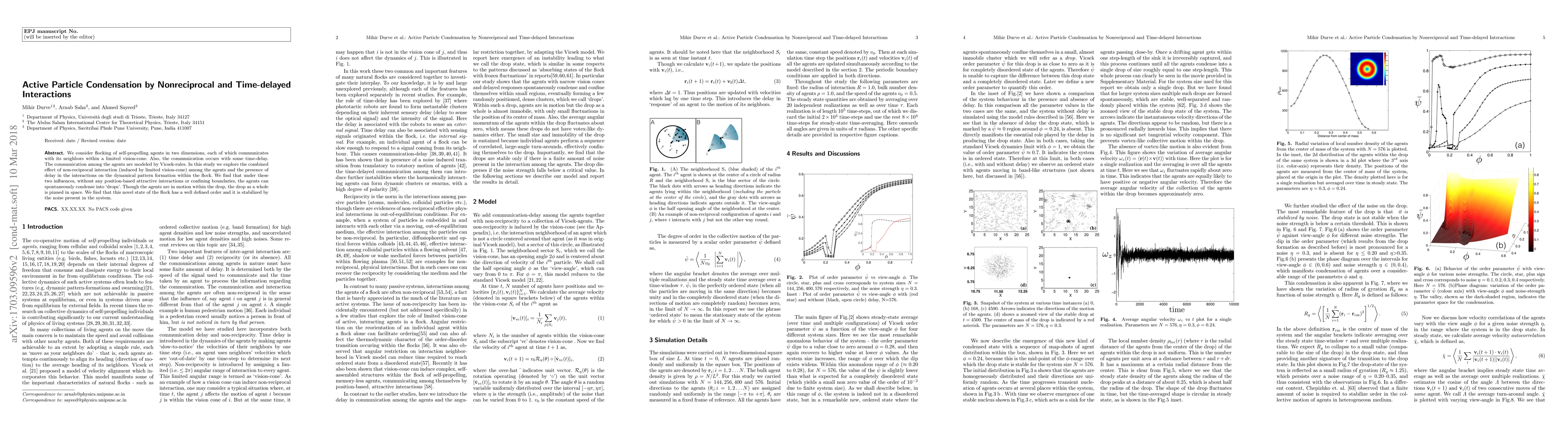 We consider flocking of self-propelling agents in two dimensions, each of which communicates with its neighbors within a limited vision cone. Also, the communication occurs with some delay. The communication among the agents are modeled by Vicsek rules. In this study we explore the effect of non-reciprocal interaction among the agents, induced by their vision cone, together with the delayed interactions on the dynamical pattern formation within the flock. We find that under these two influences and without any position based attractive interactions or confining boundaries, the agents can spontaneously condense into drops. Though the agents are in motion within the drop, the drop as whole is virtually pinned in space. We also find that this novel state of the flock has a well defined order stabilized by the noise present in the system.