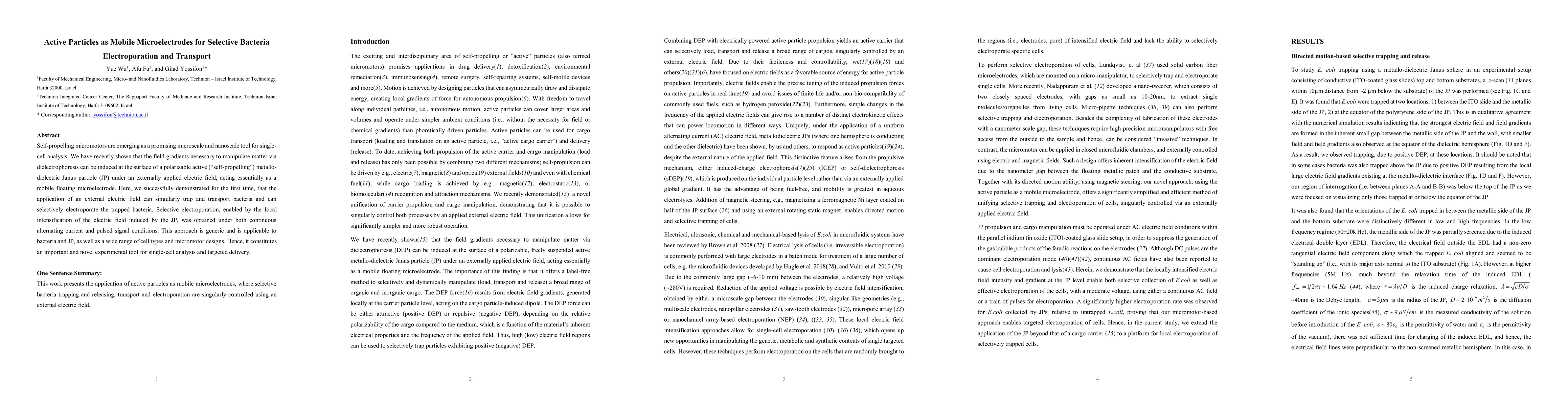 Self-propelling micromotors are emerging as a promising microscale and nanoscale tool for single-cell analysis. We have recently shown that the field gradients necessary to manipulate matter via dielectrophoresis can be induced at the surface of a polarizable active (self-propelling) metallo-dielectric Janus particle (JP) under an externally applied electric field, acting essentially as a mobile floating microelectrode. Here, we successfully demonstrated for the first time, that the application of an external electric field can singularly trap and transport bacteria and can selectively electroporate the trapped bacteria. Selective electroporation, enabled by the local intensification of the electric field induced by the JP, was obtained under both continuous alternating current and pulsed signal conditions. This approach is generic and is applicable to bacteria and JP, as well as a wide range of cell types and micromotor designs. Hence, it constitutes an important and novel experimental tool for single-cell analysis and targeted delivery.