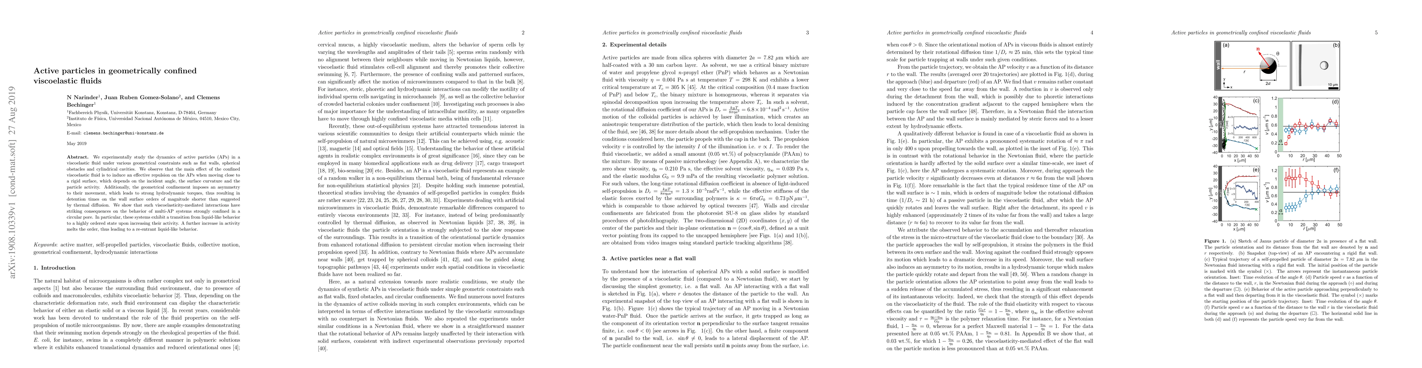 This study investigates the dynamics of active particles in viscoelastic fluids under geometric constraints, revealing that confined viscoelasticity induces effective repulsion and asymmetric movement, leading to strong hydrodynamic torques. The research finds a transition from liquid-like to ordered states in multi-particle systems, which reverts to liquid-like behavior upon increased activity.
