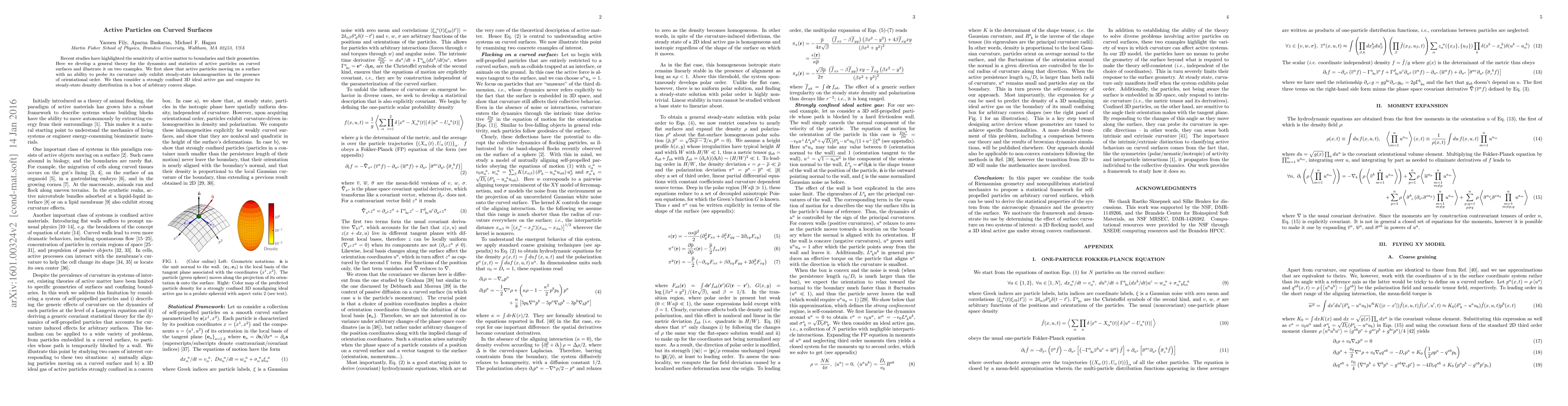 This paper develops a theory for active particles' dynamics and statistics on curved surfaces, showing that particles without curvature-sensing abilities produce steady-state inhomogeneities when orientationally ordered. It further examines a confined 3D ideal active gas, computing its steady-state density distribution in convex-shaped boxes.