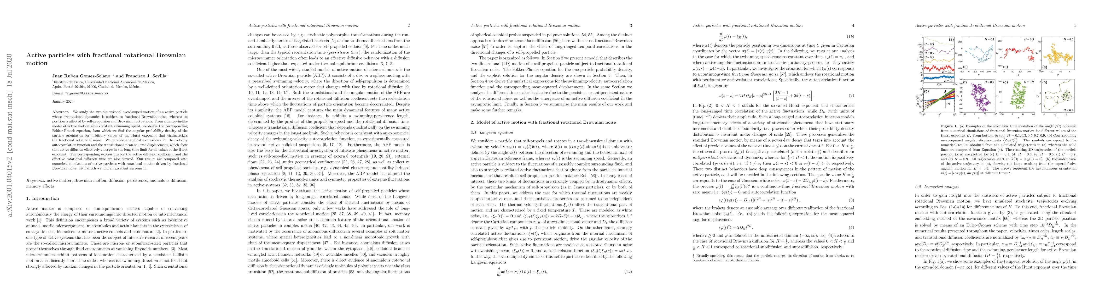 We study the two-dimensional overdamped motion of an active particle whose orientational dynamics is subject to fractional Brownian noise, whereas its position is affected by self-propulsion and Brownian fluctuations. From a Langevin-like model of active motion with constant swimming speed, we derive the corresponding Fokker-Planck equation, from which we find the angular probability density of the particle orientation for arbitrary values of the Hurst exponent that characterizes the fractional rotational noise. We provide analytical expressions for the velocity autocorrelation function and the translational mean-squared displacement, which show that active diffusion effectively emerges in the long-time limit for all values of the Hurst exponent. The corresponding expressions for the active diffusion coefficient and the effective rotational diffusion time are also derived. Our results are compared with numerical simulations of active particles with rotational motion driven by fractional Brownian noise, with which we find an excellent agreement.