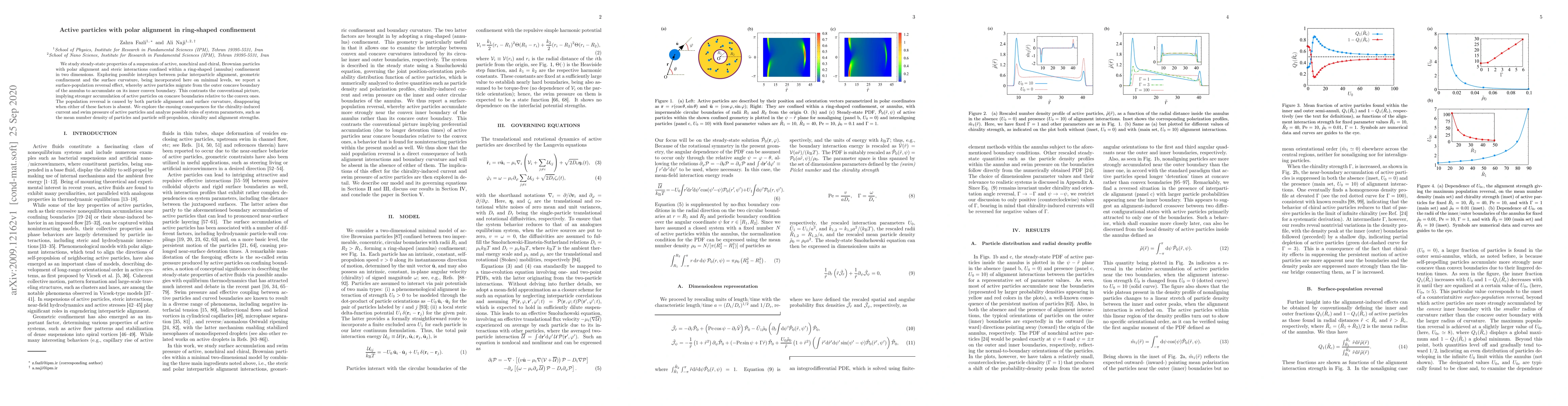 This study investigates the steady-state behavior of active particles in a ring-shaped confinement, revealing a surface-population reversal effect where particles migrate from the outer concave to the inner convex boundary, contrary to typical expectations. The reversal is attributed to the interplay between polar alignment and surface curvature, with implications for chirality-induced currents and swim pressure.