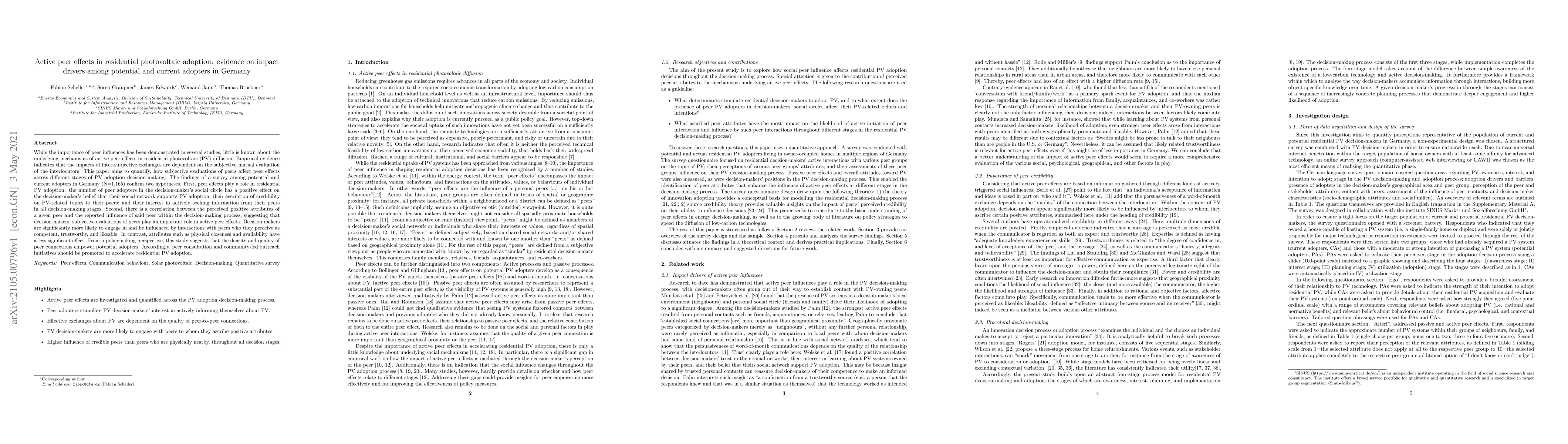 This paper investigates active peer effects in residential photovoltaic (PV) adoption in Germany, finding that peer influences are driven by decision-makers' subjective evaluations of peer competence, trustworthiness, and likeability. The study recommends promoting peer consultation and community outreach to enhance PV adoption.