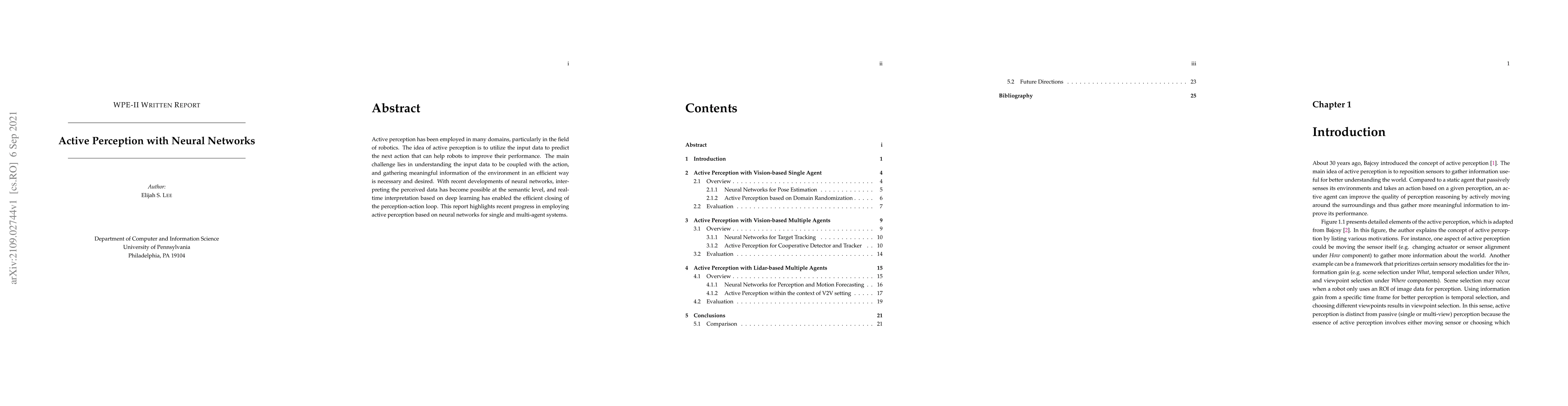 Active perception has been employed in many domains, particularly in the field of robotics. The idea of active perception is to utilize the input data to predict the next action that can help robots to improve their performance. The main challenge lies in understanding the input data to be coupled with the action, and gathering meaningful information of the environment in an efficient way is necessary and desired. With recent developments of neural networks, interpreting the perceived data has become possible at the semantic level, and real-time interpretation based on deep learning has enabled the efficient closing of the perception-action loop. This report highlights recent progress in employing active perception based on neural networks for single and multi-agent systems.