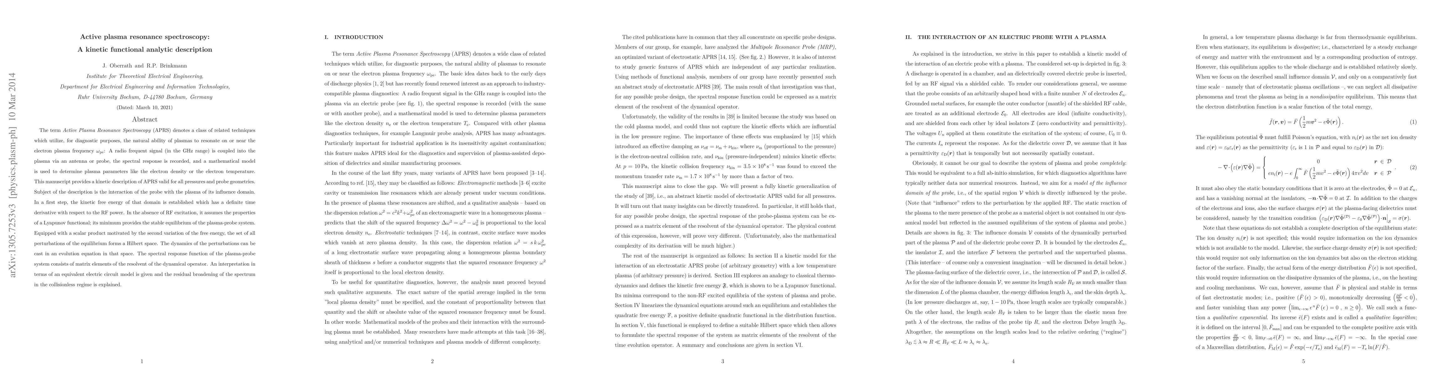 The term "Active Plasma Resonance Spectroscopy" (APRS) denotes a class of related techniques which utilize, for diagnostic purposes, the natural ability of plasmas to resonate on or near the electron plasma frequency $\omega_{\rm pe}$: A radio frequent signal (in the GHz range) is coupled into the plasma via an antenna or probe, the spectral response is recorded, and a mathematical model is used to determine plasma parameters like the electron density or the electron temperature. This manuscript provides a kinetic description of APRS valid for all pressures and probe geometries. Subject of the description is the interaction of the probe with the plasma of its influence domain. In a first step, the kinetic free energy of that domain is established which has a definite time derivative with respect to the RF power. In the absence of RF excitation, it assumes the properties of a Lyapunov functional; its minimum provides the stable equilibrium of the plasma-probe system. Equipped with a scalar product motivated by the second variation of the free energy, the set of all perturbations of the equilibrium forms a Hilbert space. The dynamics of the perturbations can be cast in an evolution equation in that space. The spectral response function of the plasma-probe system consists of matrix elements of the resolvent of the dynamical operator. An interpretation in terms of an equivalent electric circuit model is given and the residual broadening of the spectrum in the collisionless regime is explained.