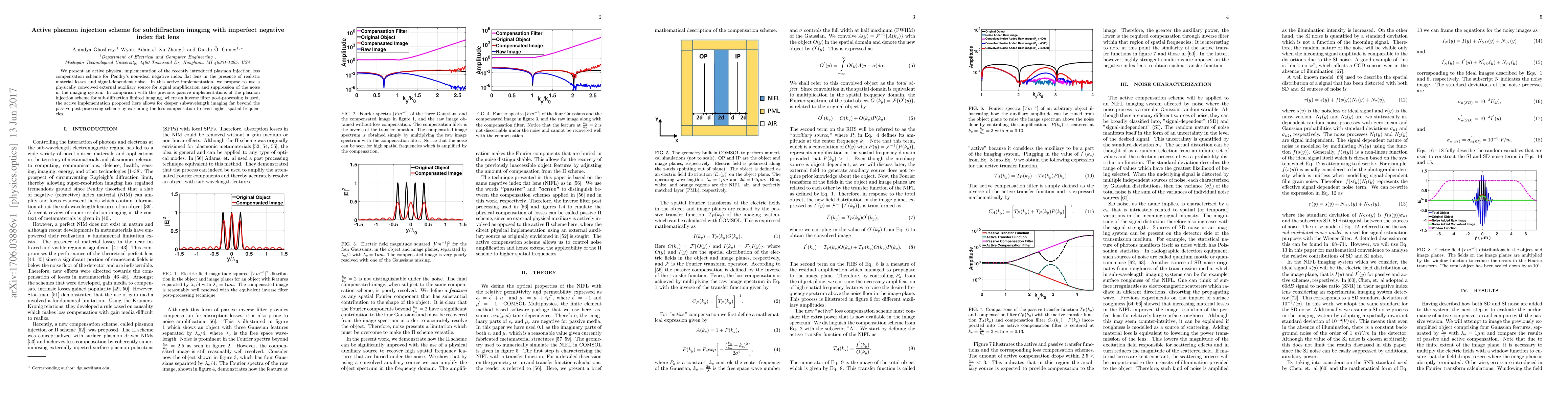 We present an active physical implementation of the recently introduced plasmon injection loss compensation scheme for Pendry's non-ideal negative index flat lens in the presence of realistic material losses and signal-dependent noise. In this active implementation, we propose to use a physically convolved external auxiliary source for signal amplification and suppression of the noise in the imaging system. In comparison with the previous passive implementations of the plasmon injection scheme for sub-diffraction limited imaging, where an inverse filter post-processing is used, the active implementation proposed here allows for deeper subwavelength imaging far beyond the passive post-processing scheme by extending the loss compensation to even higher spatial frequencies.